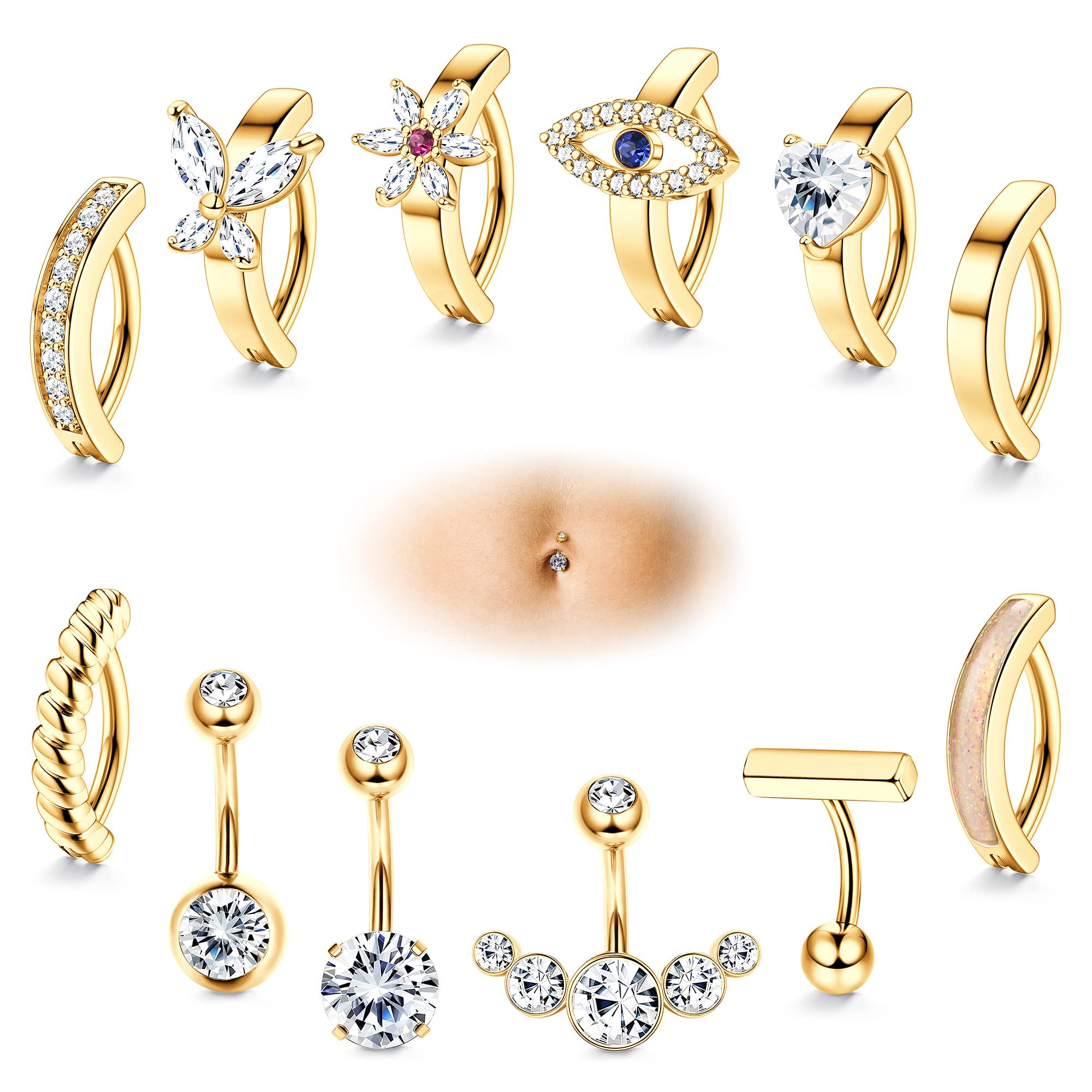 12 anillos de ombligo de acero quirúrgico de 14 g para mujer, con forma de circonita cúbica, con forma de corazón, malos de ojos curvos, para ombligo, para piercing corporal, joyería