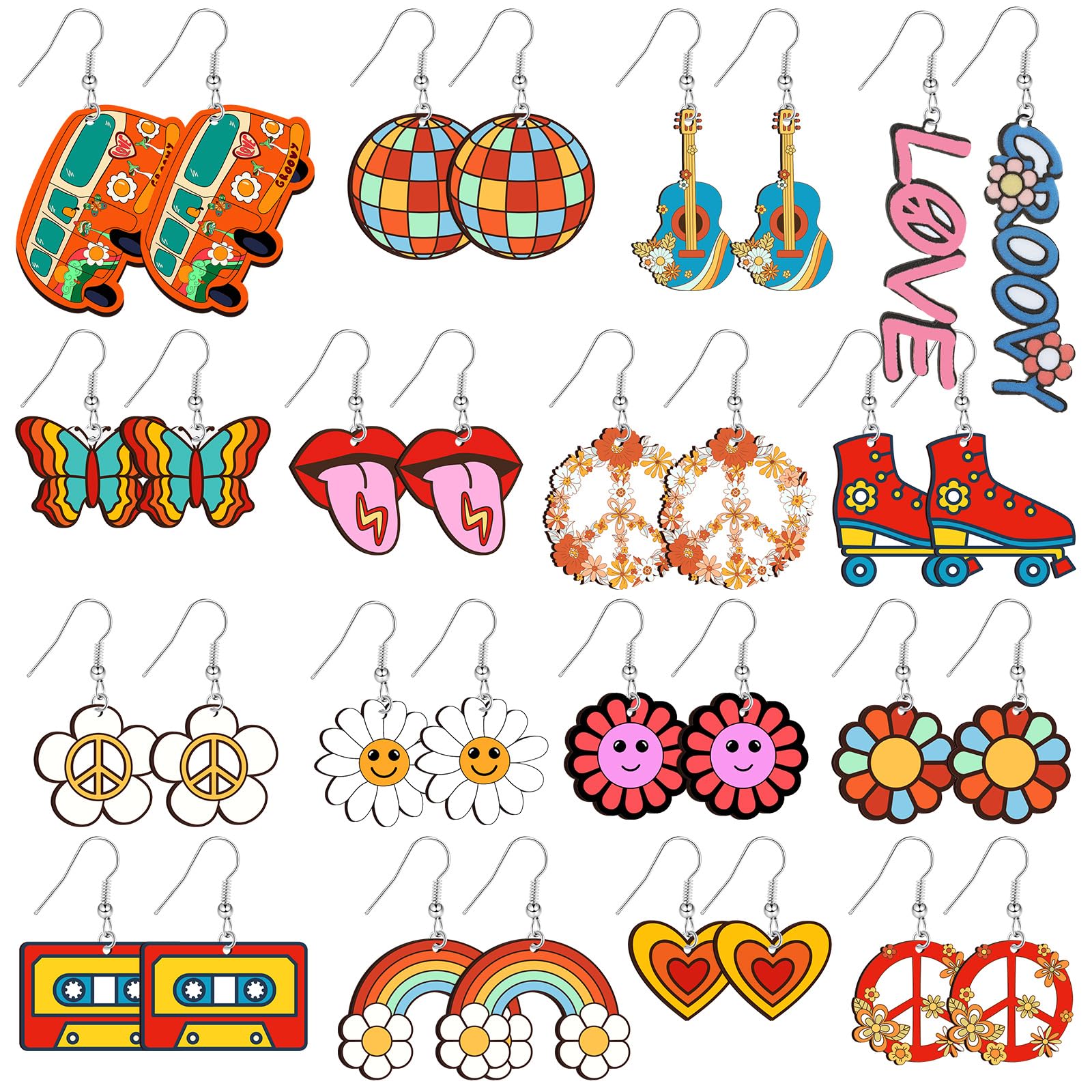 16 pares de aretes hippie para mujer de los años 70 y 80, aretes de acrílico retro bohemios con diseño de mariposa, arcoíris y margarita, para mujer, para regalo de viaje de verano, joyería