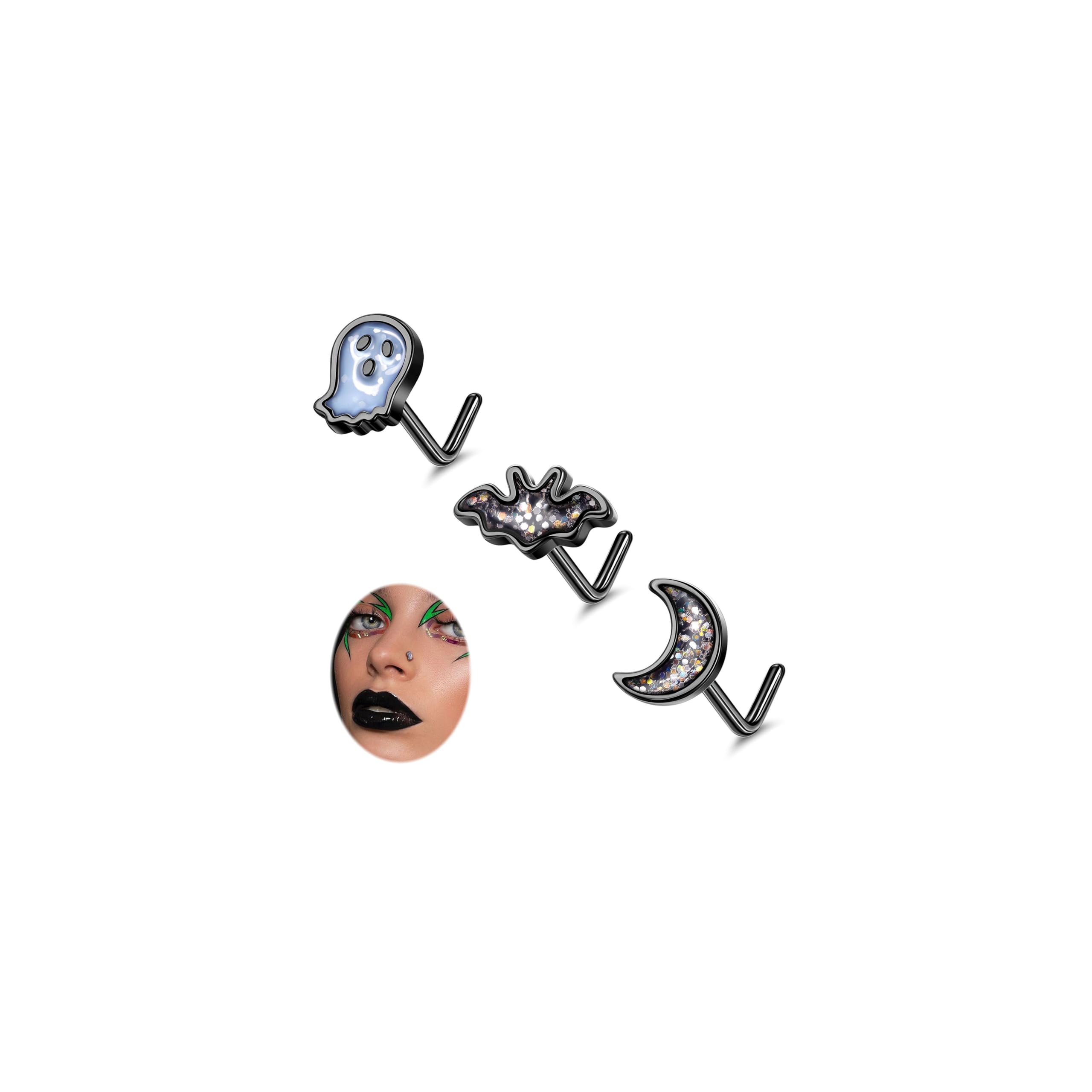 3 piezas de acero inoxidable 316L de 20 g para Halloween de nariz para mujeres y hombres, murciélago, en forma de L, aretes de nariz de araña negra y fantasma