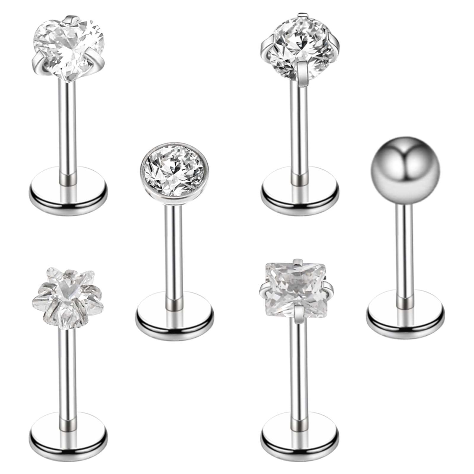 6 aretes de trago para mujer, con parte trasera plana, circonita, tragus, aretes de cartílago, acero inoxidable, oro, hélice, joyería de 8 mm de longitud del tallo, Una talla, Acero inoxidable, No es