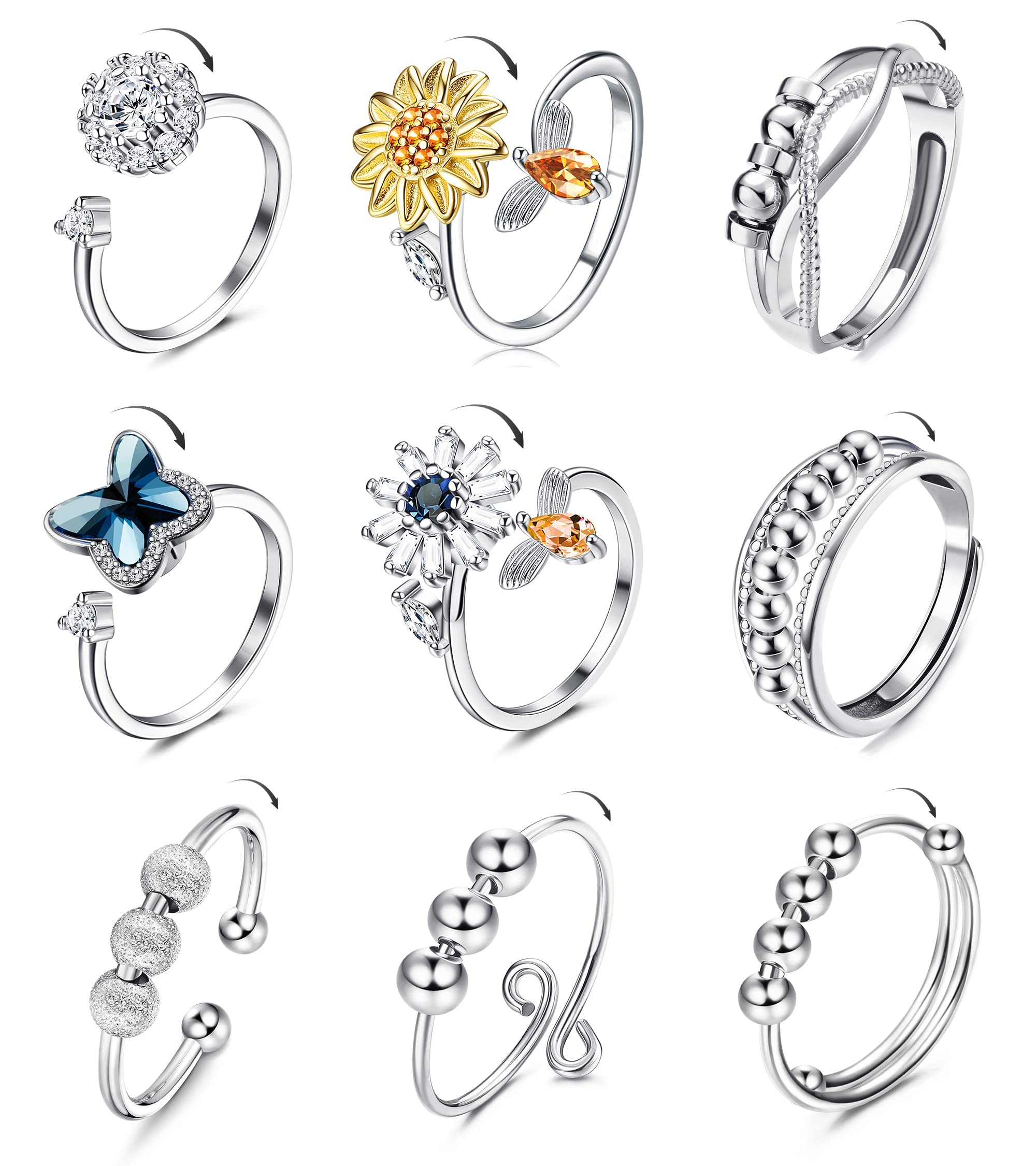 9Pcs Fidget Anxiety Rings for Women Spinner Fidget Rings for Anxiety Adjustable Cubic Zirconia Flower Butterfly Sunflower Bead Stress Relief Spinning Stackable Ring Set with Box
