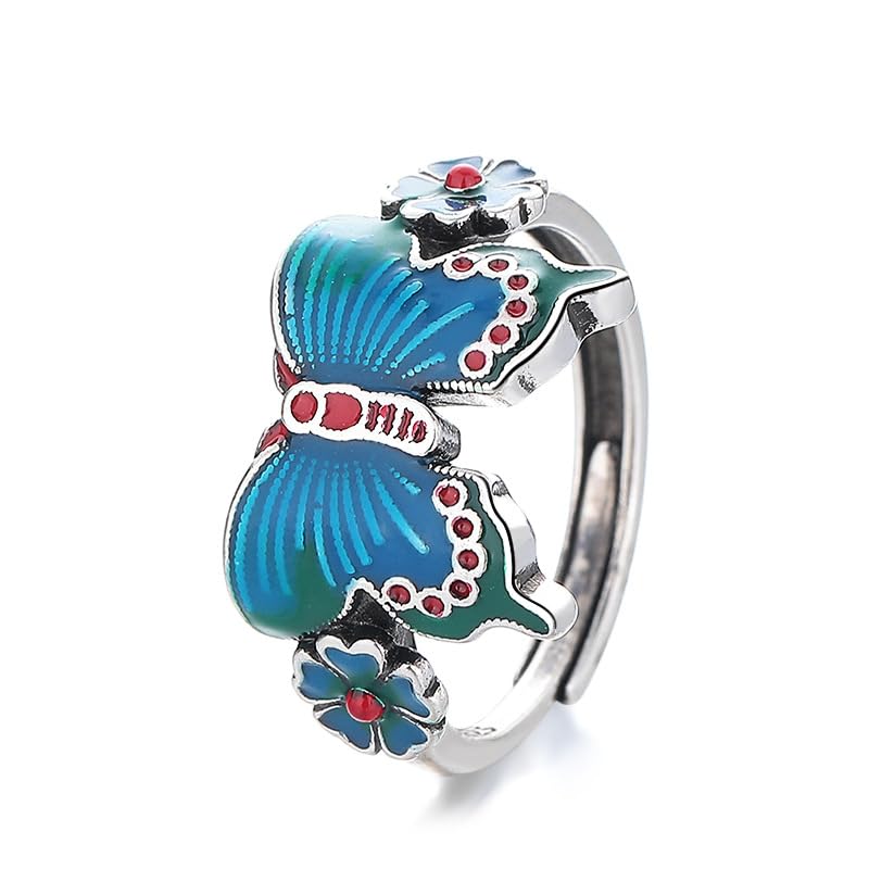 Anillo de declaración de flores de mariposa, banda esmaltada chapada en plata, diseño floral colorido, Plata de ley, Sin piedras preciosas