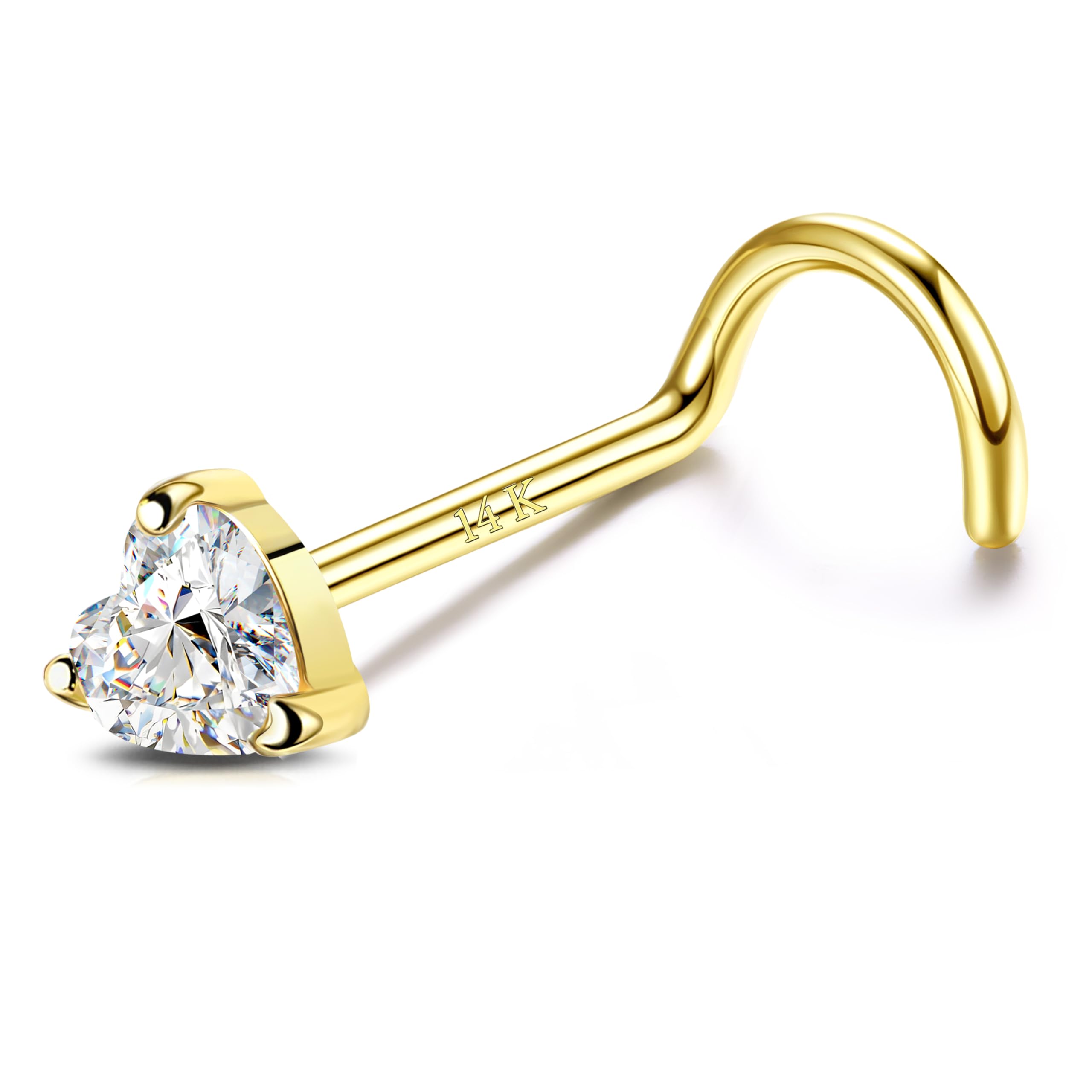 Anillos de nariz de oro real de 14 quilates con diamantes de imitación de corazón, circonita, sacacorchos, anillos de nariz de oro sólido, aretes de nariz hipoalergénicos para mujeres y