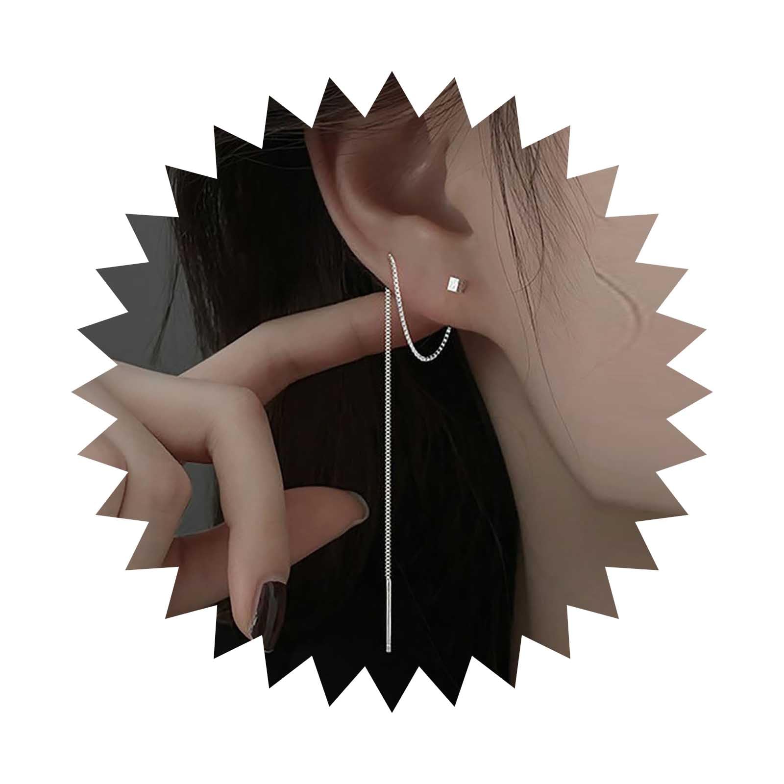 arete colgantes de cadena larga bohemia, cadena de plata, arete de enhebrador de orejas de cubeta, arete de hilo de cadena, elegantes arete de gota para mujer (cubeta)