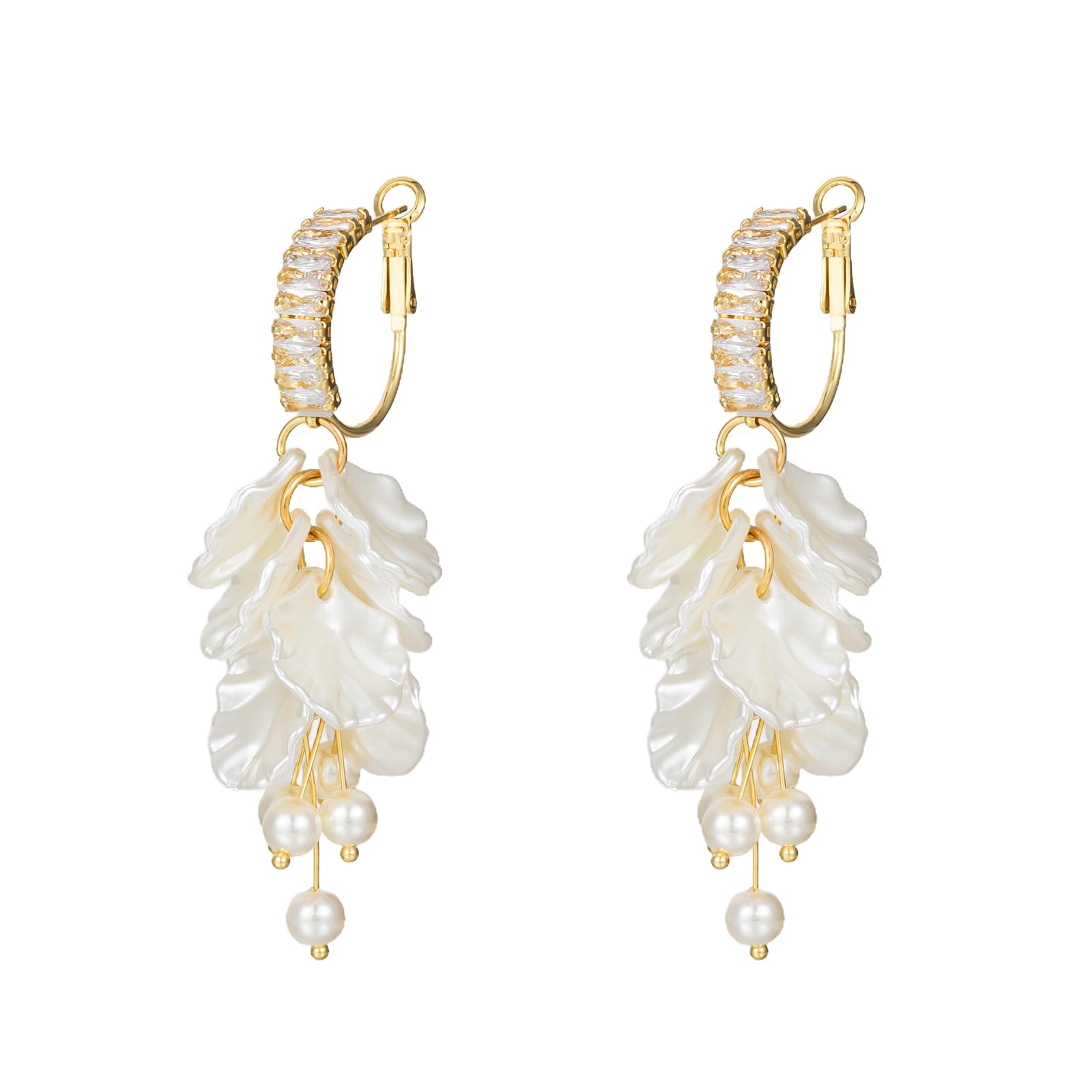 arete colgantes de perlas blancas con pétalos para mujer, largos y brillantes con circonita cúbica cúbica ligera para mujer, joyería floral para boda, fiesta, novia, dama de honor, Latón