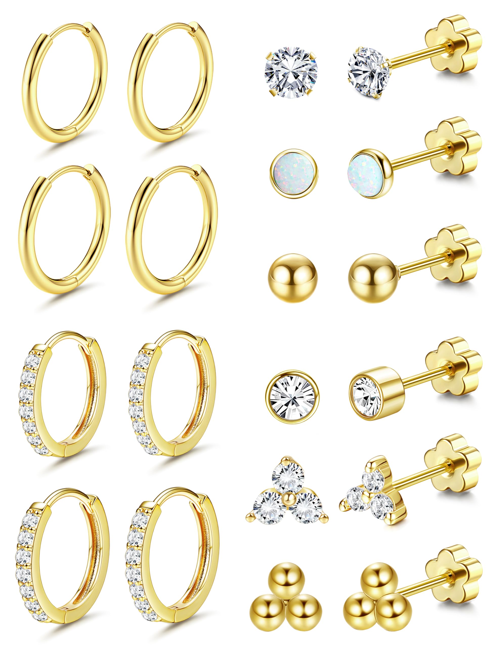arete de aro de acero quirúrgico hipoalergénico con espalda plana para múltiples piercings | Oro de 14 quilates de plata pequeño para cartílago y cartílago pequeño con circonita cúbica, bola