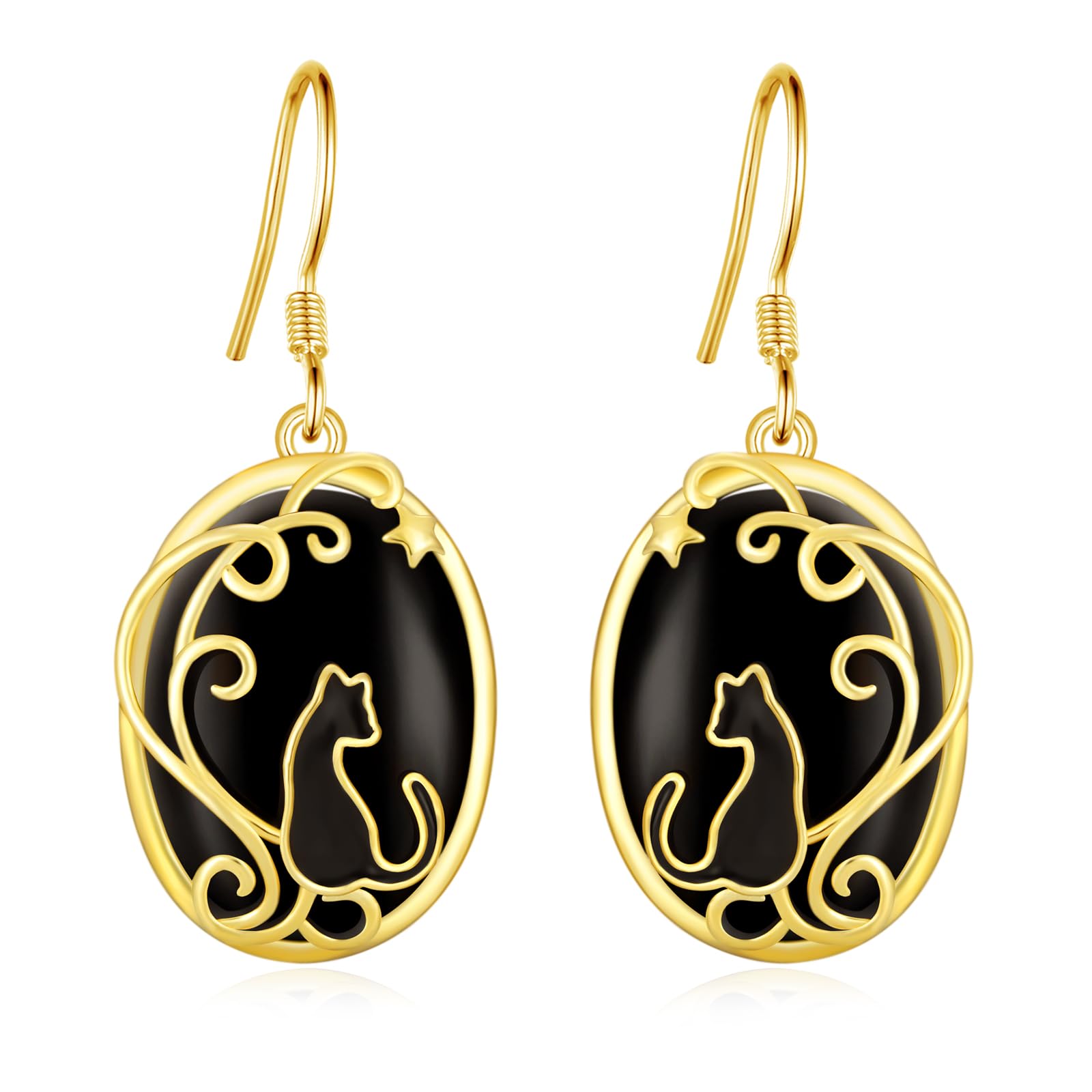 arete de gato negro de plata de ley 925 con ágata negra y gato negro, Plata de ley, Ágata