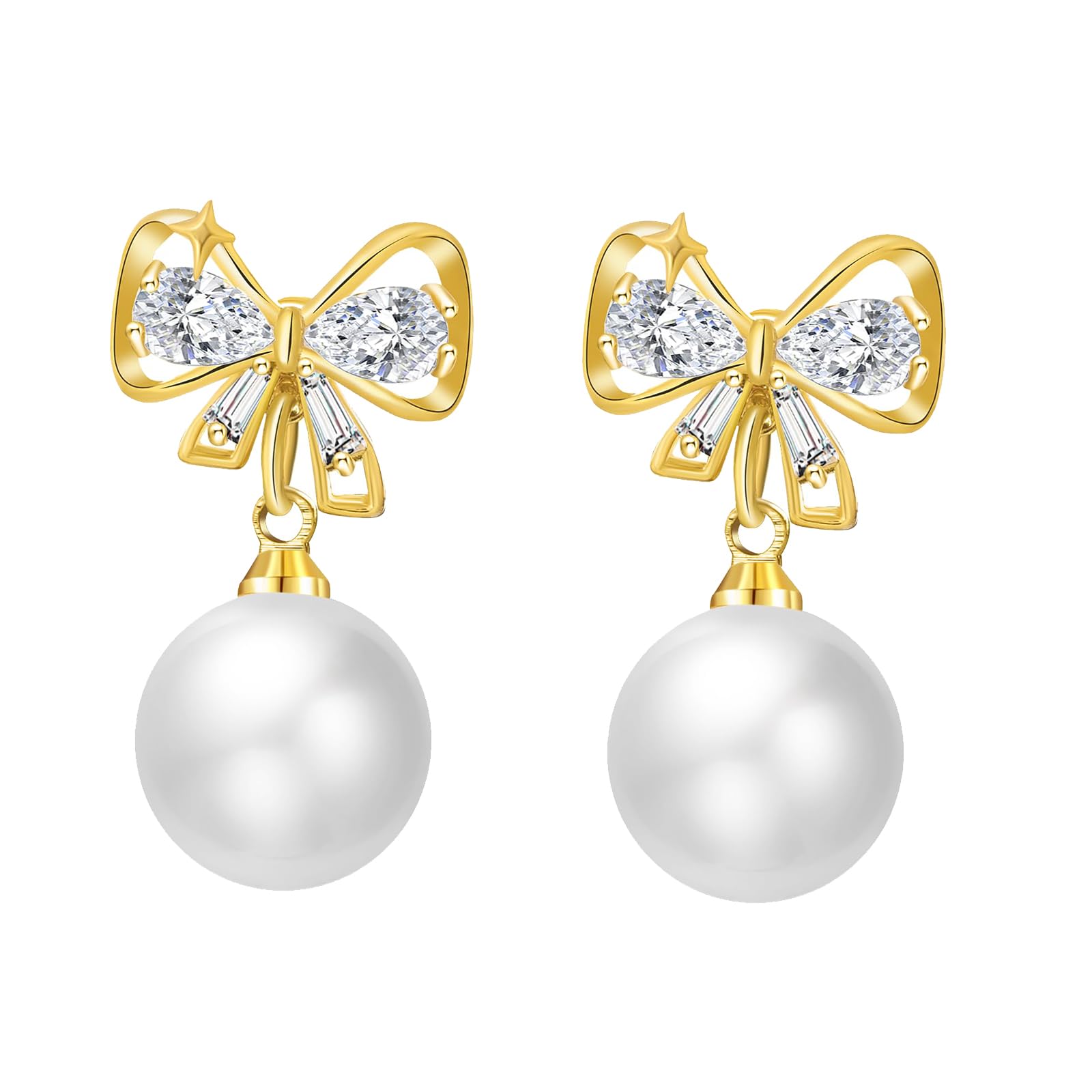 arete de lazo de perlas rosa/blanca para mujer, con clip de arco de diamantes de imitación, aretes de clip de lazo