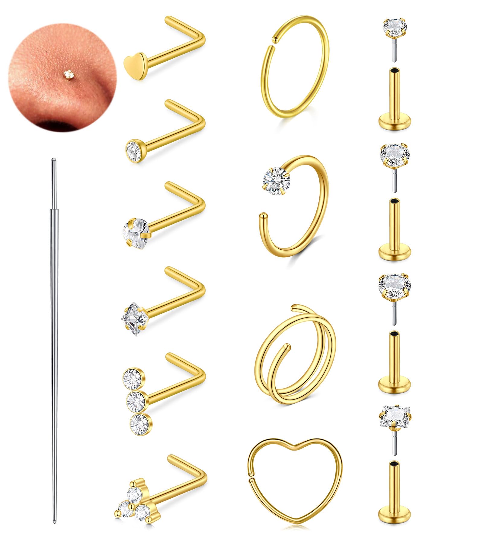 arete de nariz de oro plateado sin rosca de 20 g, con parte trasera plana, 18 g, para cartílago, parte trasera plana, punta plana, calibre 20, anillos de nariz sin rosca, para mujer, 6 mm, 8
