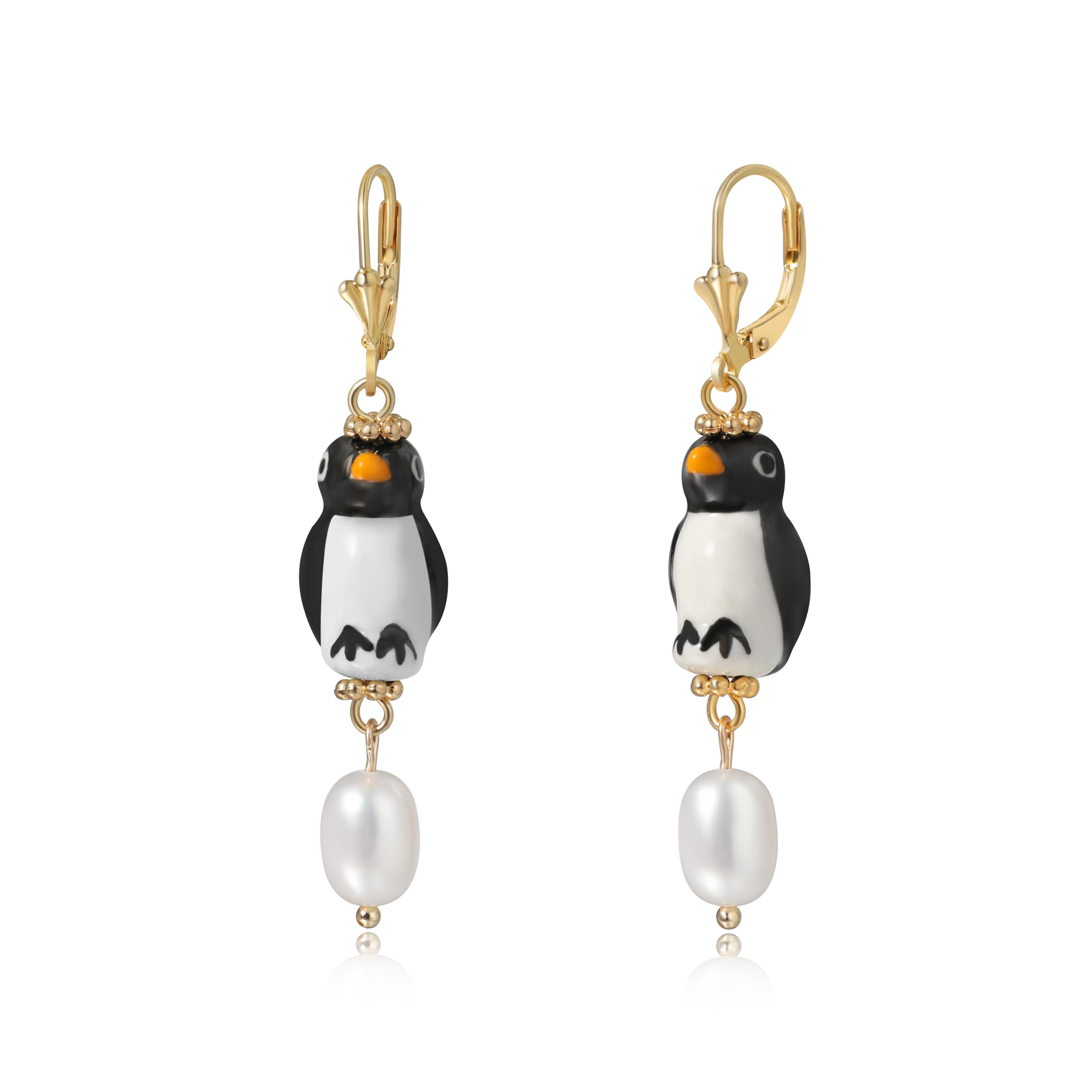 arete de pingüino de cerámica pintados a mano, gota de perlas de agua dulce, palanca chapada en oro, joyería única de arcilla hecha a mano para mujer, Oro amarillo, Perla