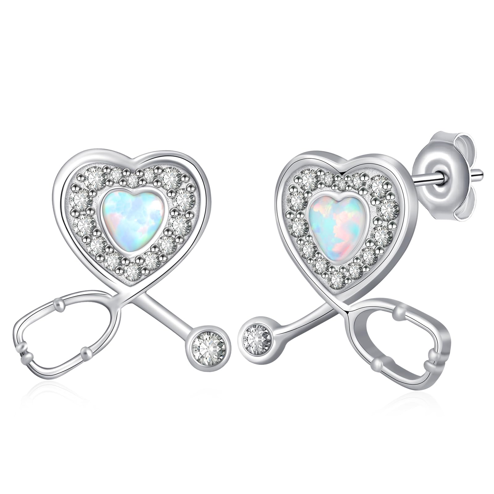 arete de plata de ley 925 con corazón de enfermera, aretes de estetoscopio, con ópalo y circonita, joyería fina, regalos para enfermera, médico, estudiante de medicina, Plata de ley, Ópalo
