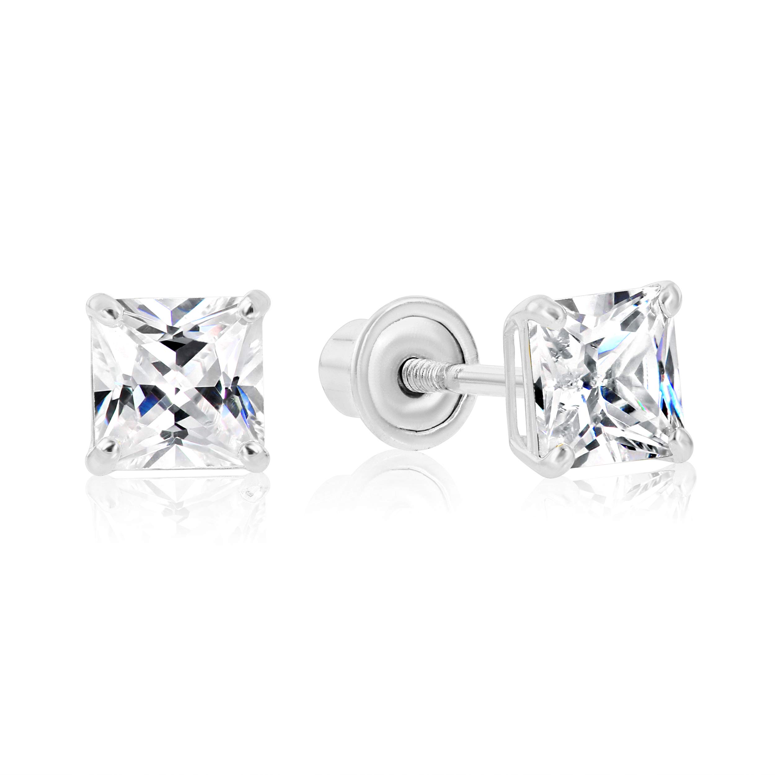 arete de tuerca de oro blanco de 14 quilates con circonita cúbica de corte princesa y cierre de rosca seguro