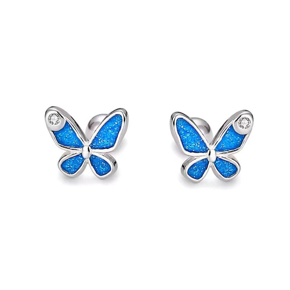 arete de tuerca de plata de ley 925, esmalte azul con vidrio, 99,9% plata pura, diseño de mariposa tridimensional