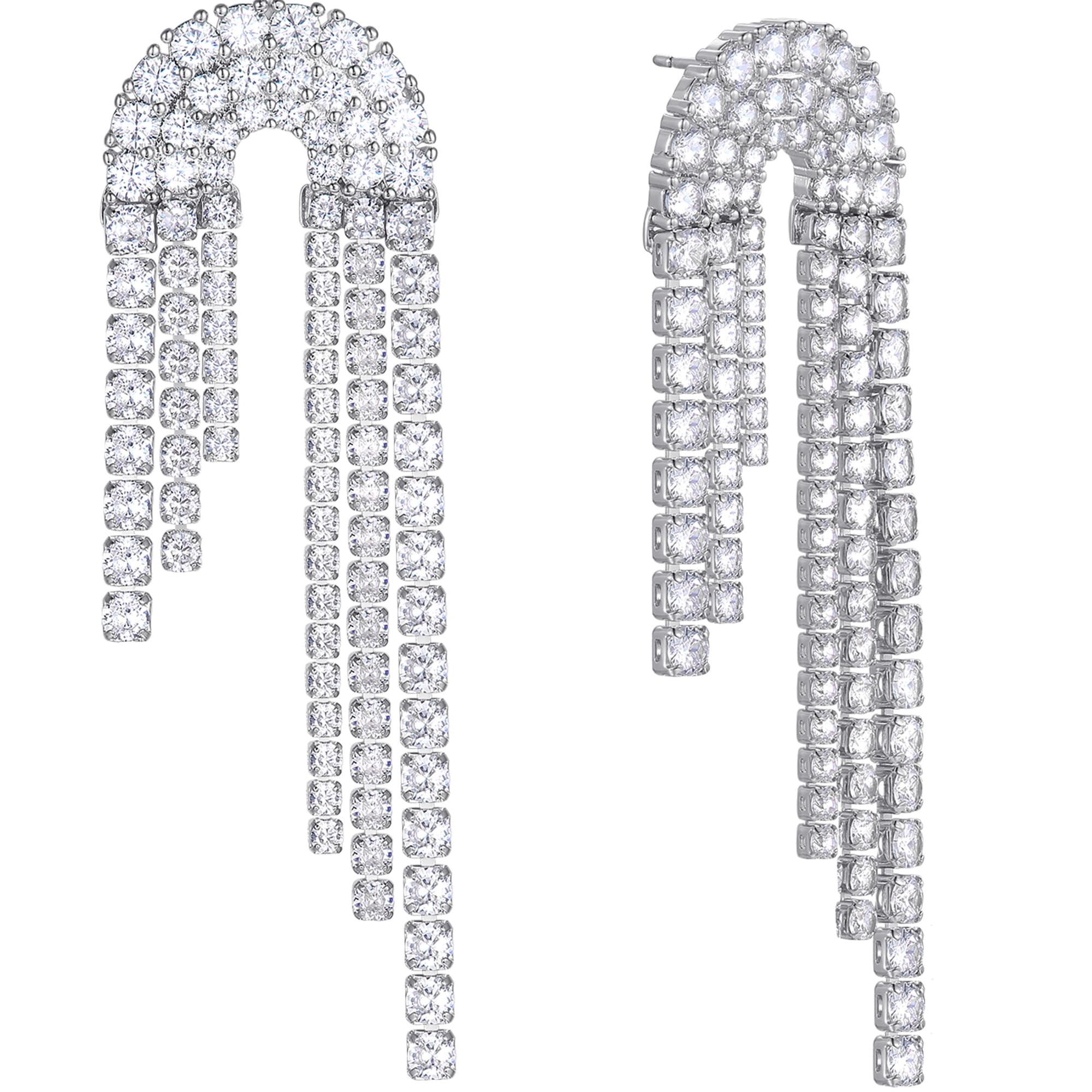 Aretes de circonita cúbica con flecos de arco | arete de declaración de cascada de diamantes de imitación para mujer, aretes redondeados con flecos adornados de vidrio, 2.5 pulgadas, Circonia cúbica