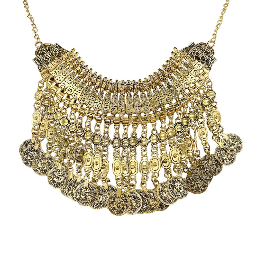 Collar clásico con borla para mujer, hombre, oro antiguo, plateado, retro, grabado, corto, grueso, bohemio, gargantilla étnica, gitana, tribal, cadena de clavícula tribal, joyería para fiesta