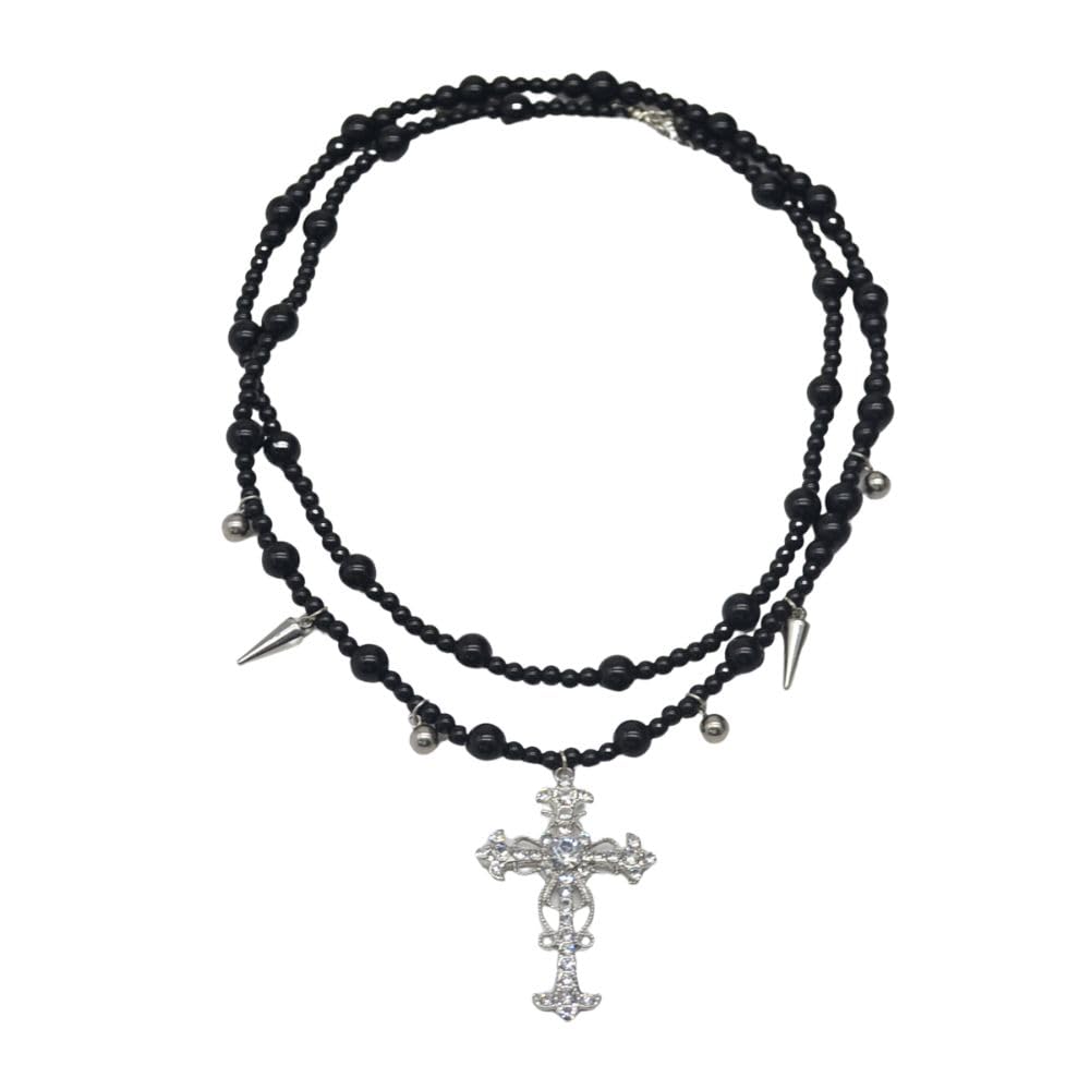 Collar con colgante de cruz gótica en capas con abalorio negras y abalorio de vidrio, circonita cúbica, cadena ajustable, regalo para mujeres y niñas, oración, Metal, Circonia cúbica