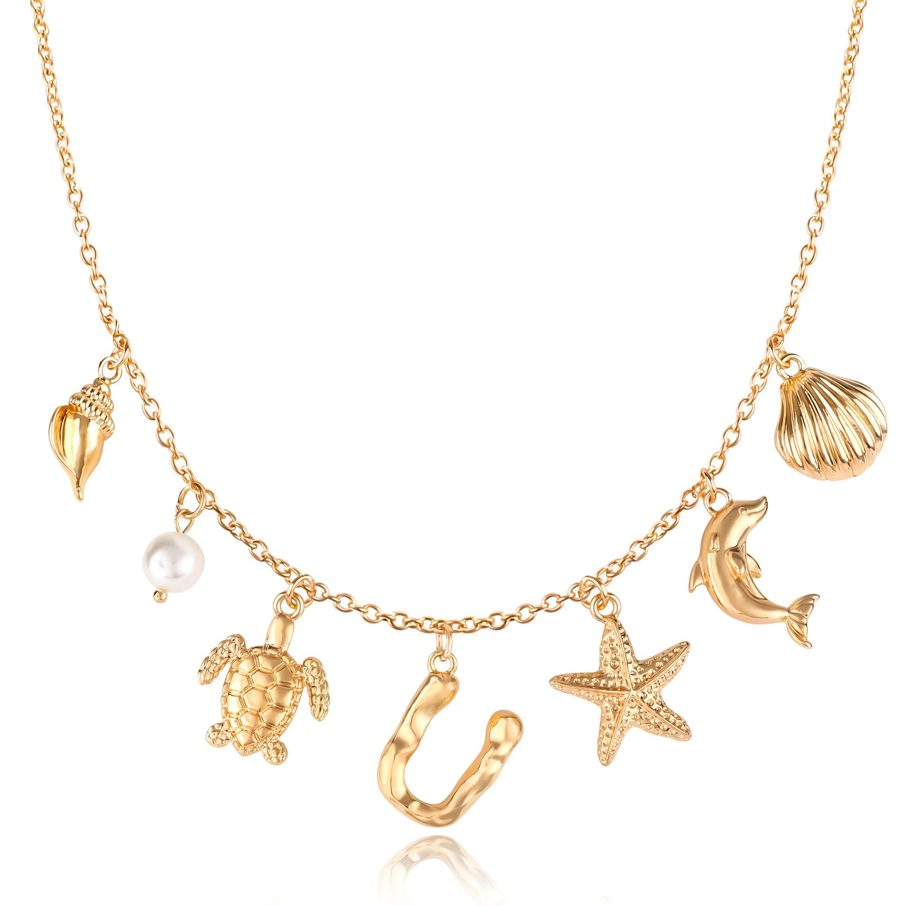 Collar con dije de inicial en U para mujer, collar de letras bohemias de verano, playa, surfera, estrella, concha, perlas, delfín, colgante de moda, gargantilla de alfabeto, regalos para adolescentes