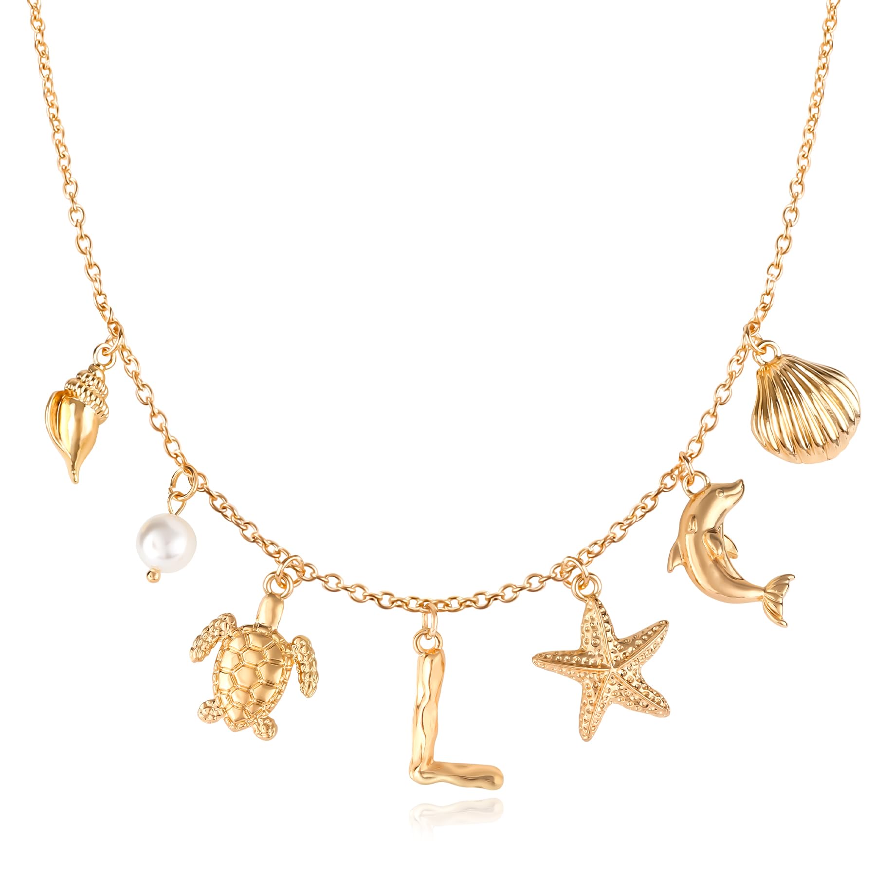 Collar con dije de inicial L para mujer, collar de letras bohemias de verano, playa, surfera, estrella, concha, perlas, delfín, colgante, colgante de moda, gargantilla de alfabeto, regalos para