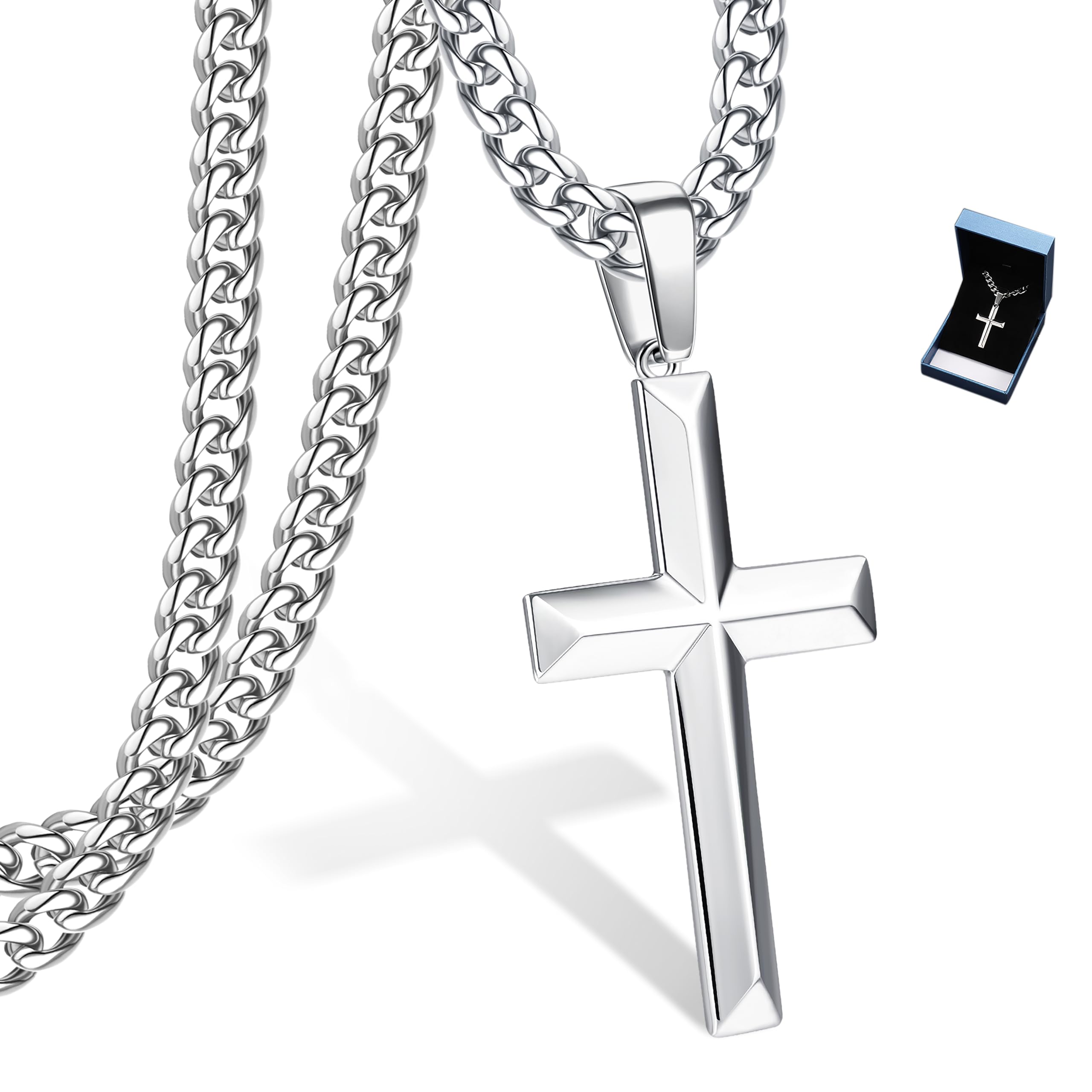 Collar de cruz de plata de ley 925 para hombres y mujeres con cadena de eslabones cubanos de acero inoxidable con corte de diamante, borde biselado y crucifijo, joyería de cruz de 16 a 24