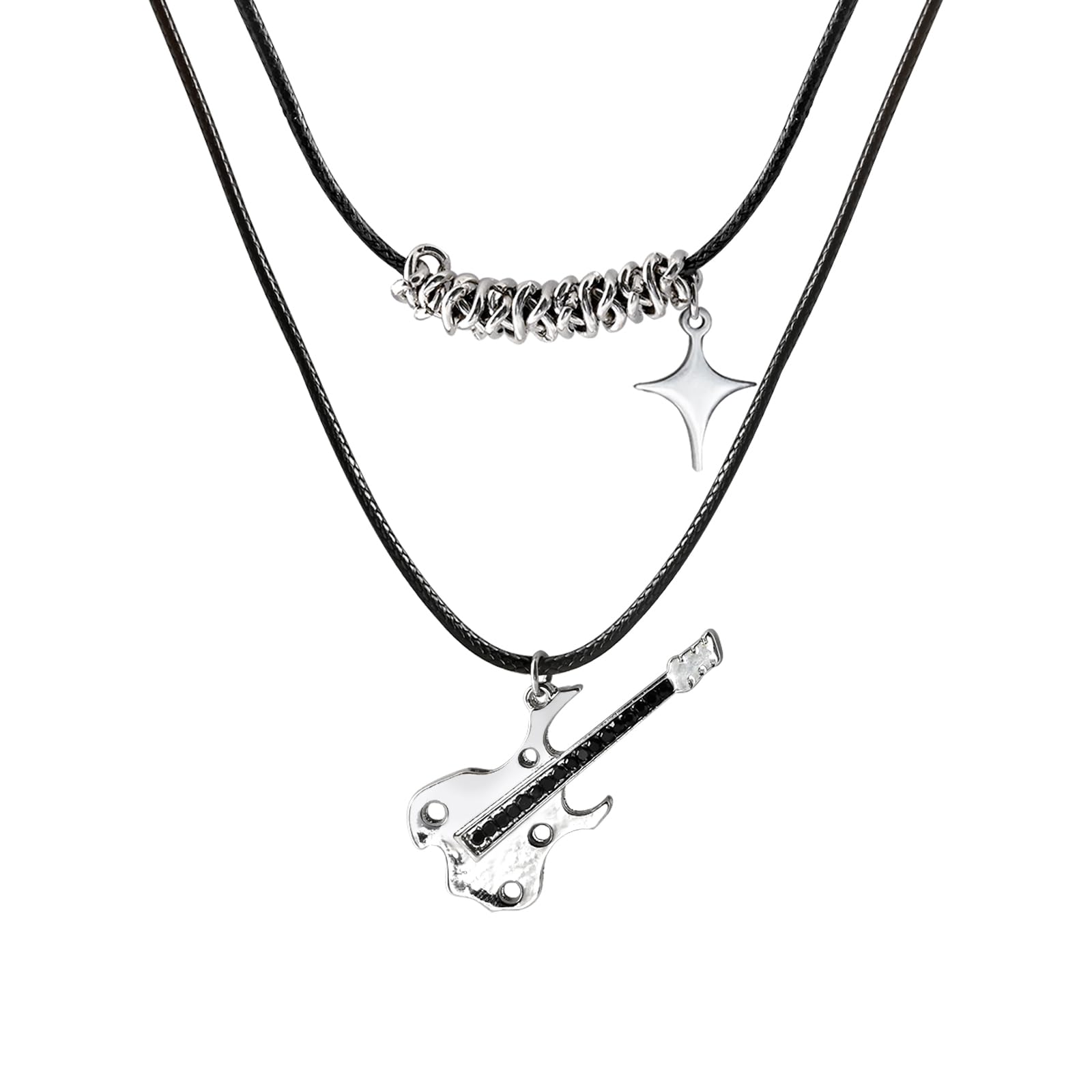 Collares de piel negro en capas para mujer, collar Y2k con guitarra eléctrica y colgante de estrella, accesorios punk para joyería musical, Cuero, Sin piedra preciosa