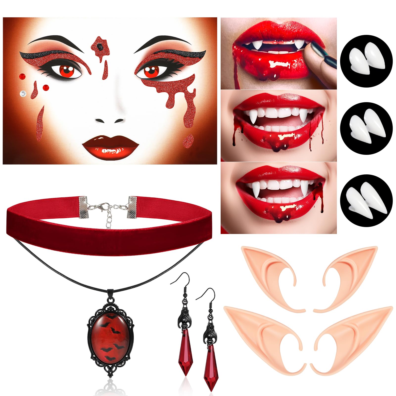 Disfraces de vampiro de Halloween para mujeres y niñas, dientes de vampiro, colmillos, orejas de elfo, joyas de cara de vampiro, gargantilla de diamantes de imitación rojo, collar de gargantilla de
