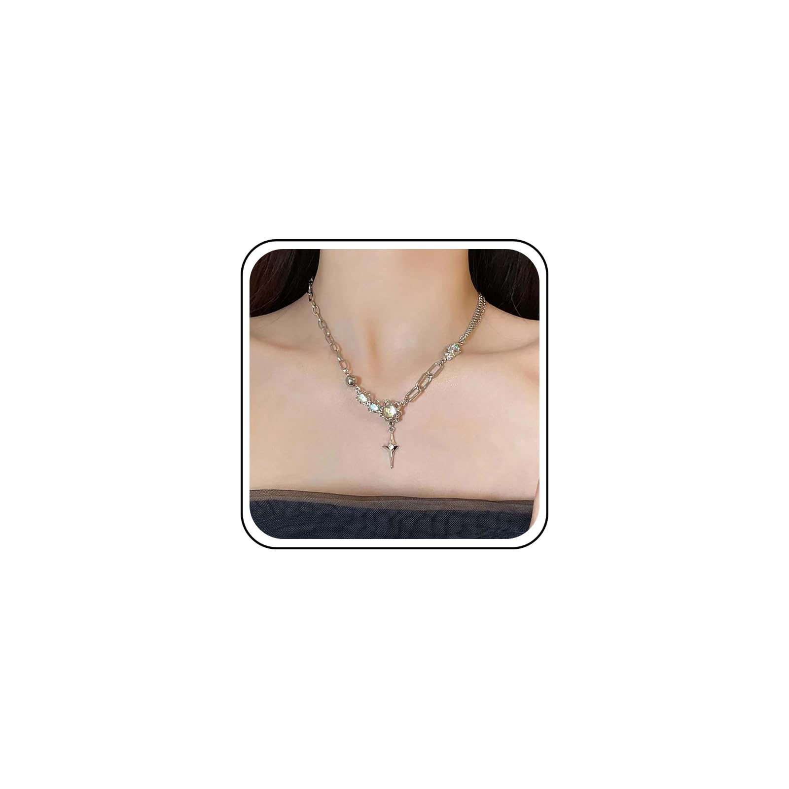 Gargantilla de estrella de vidrio bohemio de plata, con colgante de estrella de circonita cúbica, cadena de clip de papel de piedra lunar, collar de cadena de costura de piedras preciosas