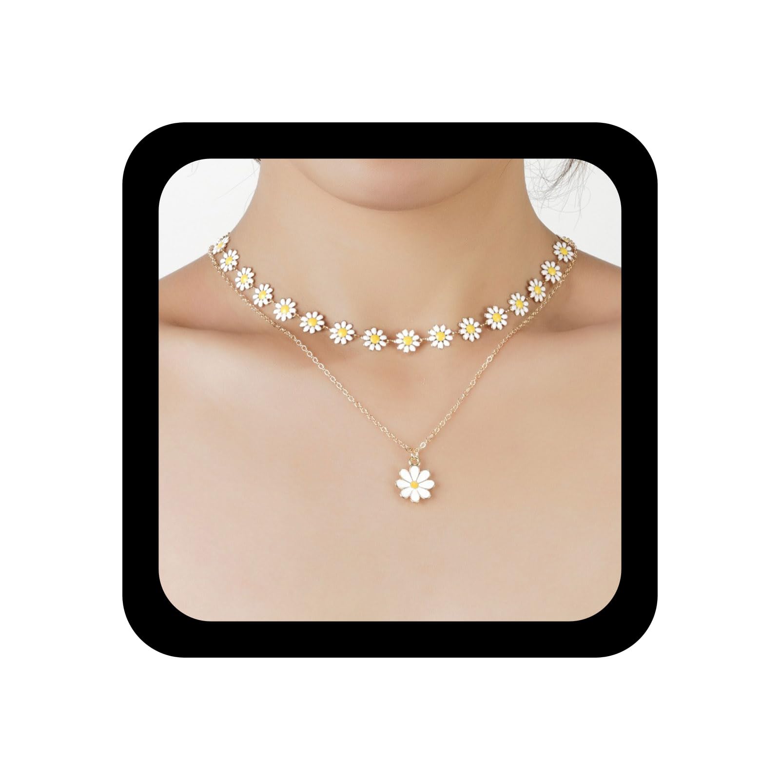 Gargantilla de flores de margaritas bohemias con colgante de margaritas en capas, collar clásico floral delicado collar de primavera para mujer, Zinc, Sin piedra preciosa
