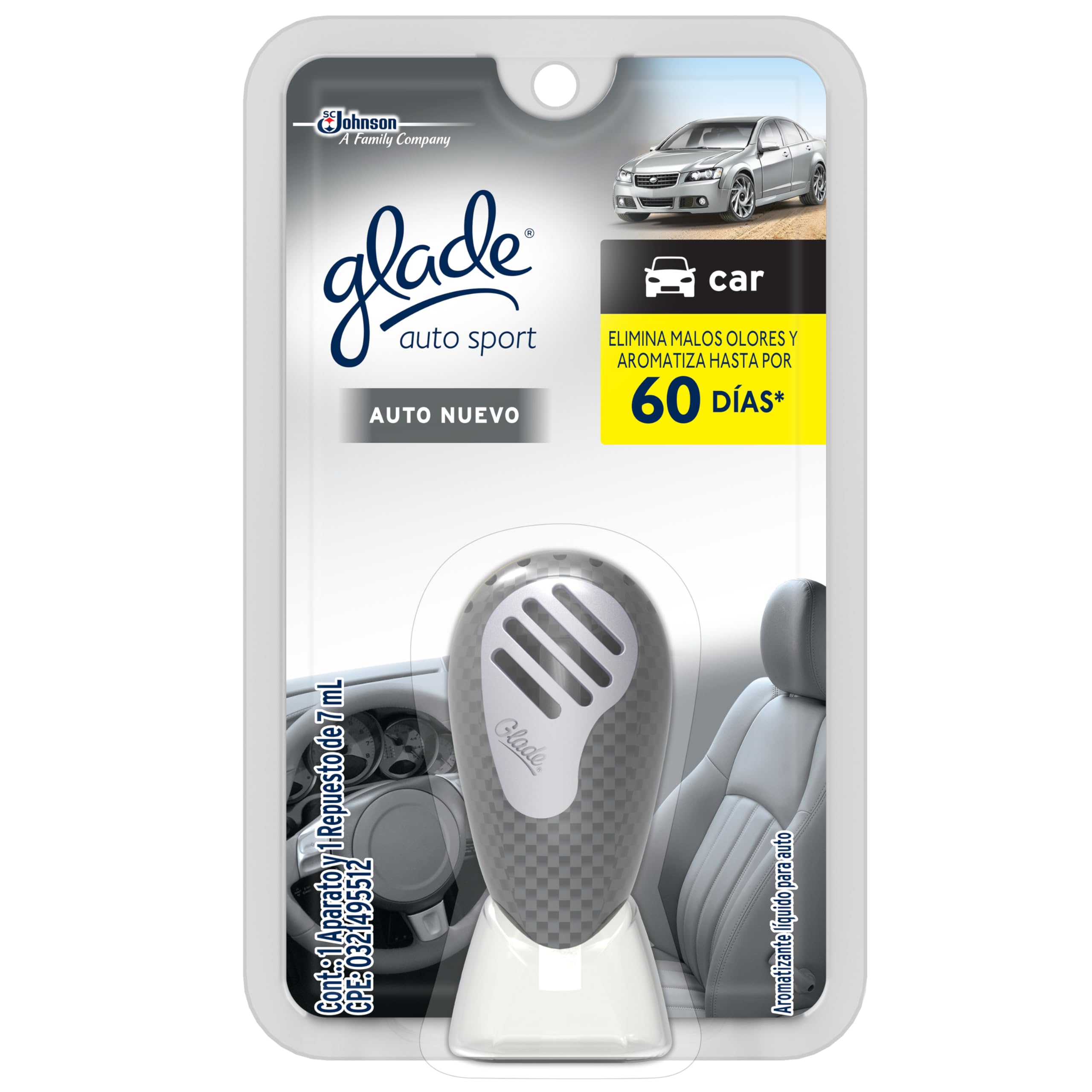 Glade Auto Sport Difusor, Aromatizante Liquido para Auto, Elimina Malos Olores y Refresca Hasta 75 Días, Aroma Auto Nuevo, Contiene 1 Aparato y 1 Repuesto, 7ml