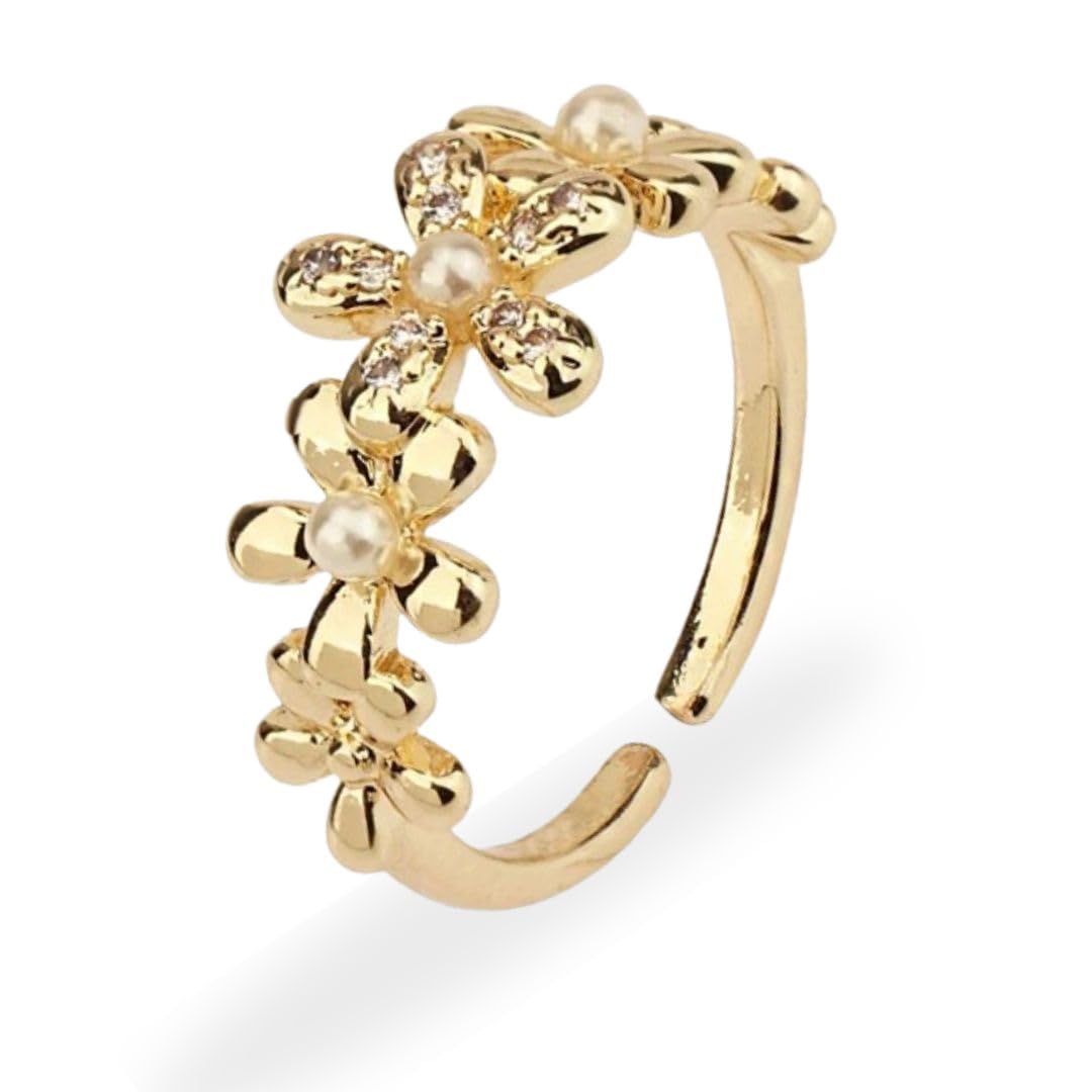 Jewelry by Hao 18K Gold Plated Flower Pareal Diamond Open Adjustable Ring or Necklace | Stackable Daisy Floral Statement Rings Layered Necklace for Women