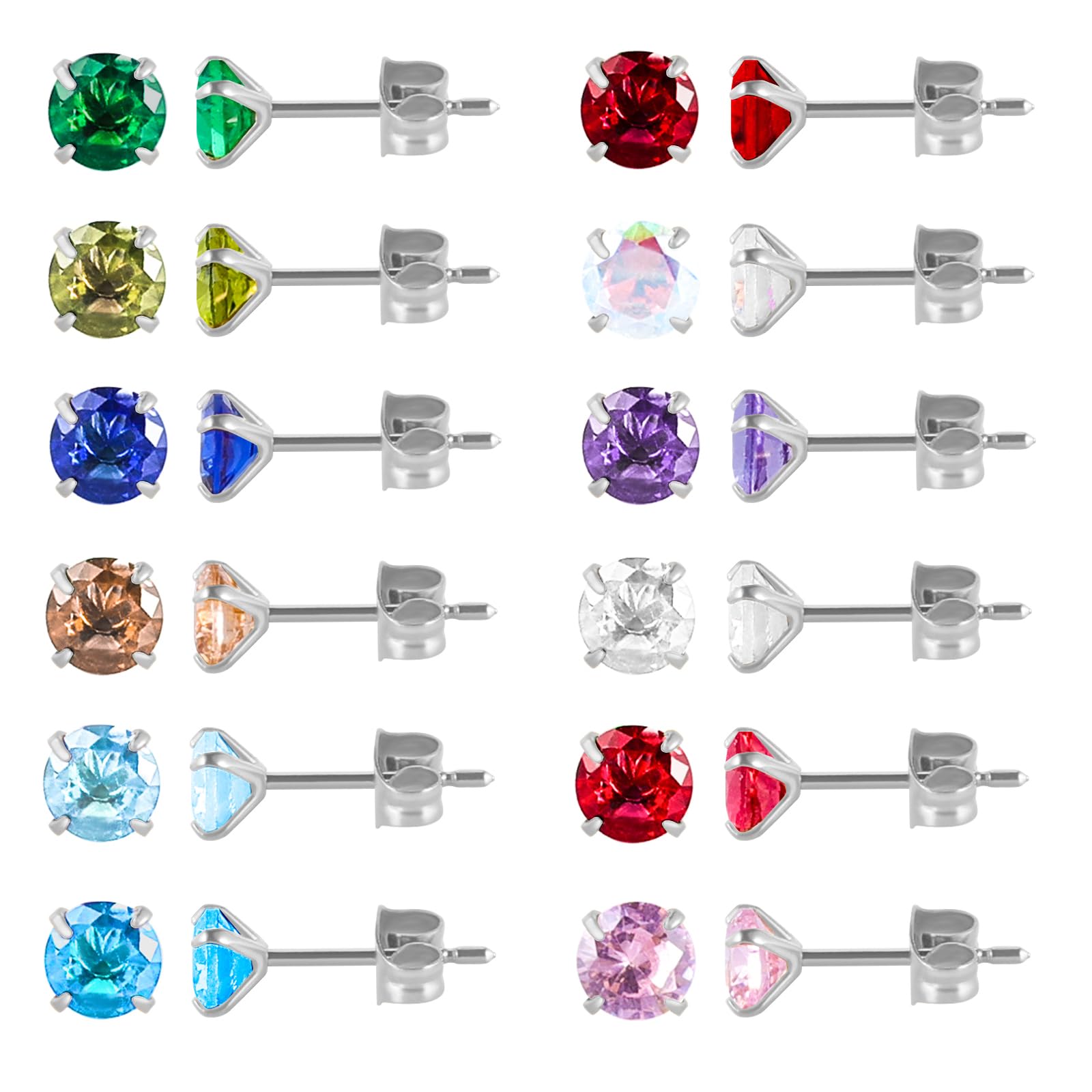 Juego de 12 pares de aretes de tuerca de acero inoxidable quirúrgico con circonita cúbica, chapados en oro, con forma de corazón de estrella, cuadrados, de corte princesa