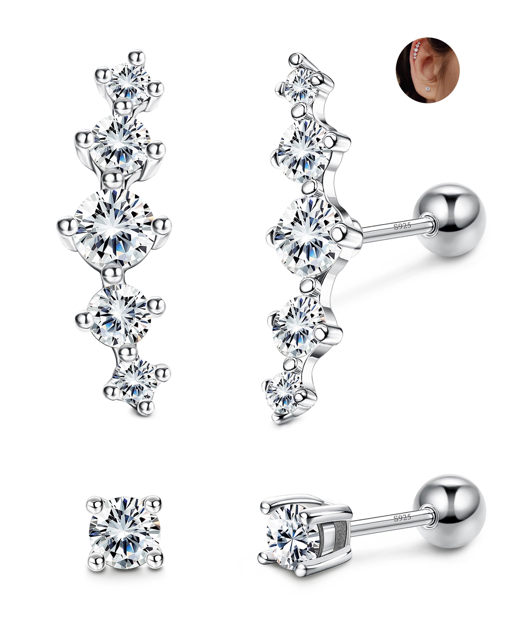 Juego de 2 pares de aretes de plata de ley para cartílago con circonita cúbica para mujer, chapados en oro blanco, arete escaladores de estrella de hoja, hélice, concha, cartílago de 20 g,