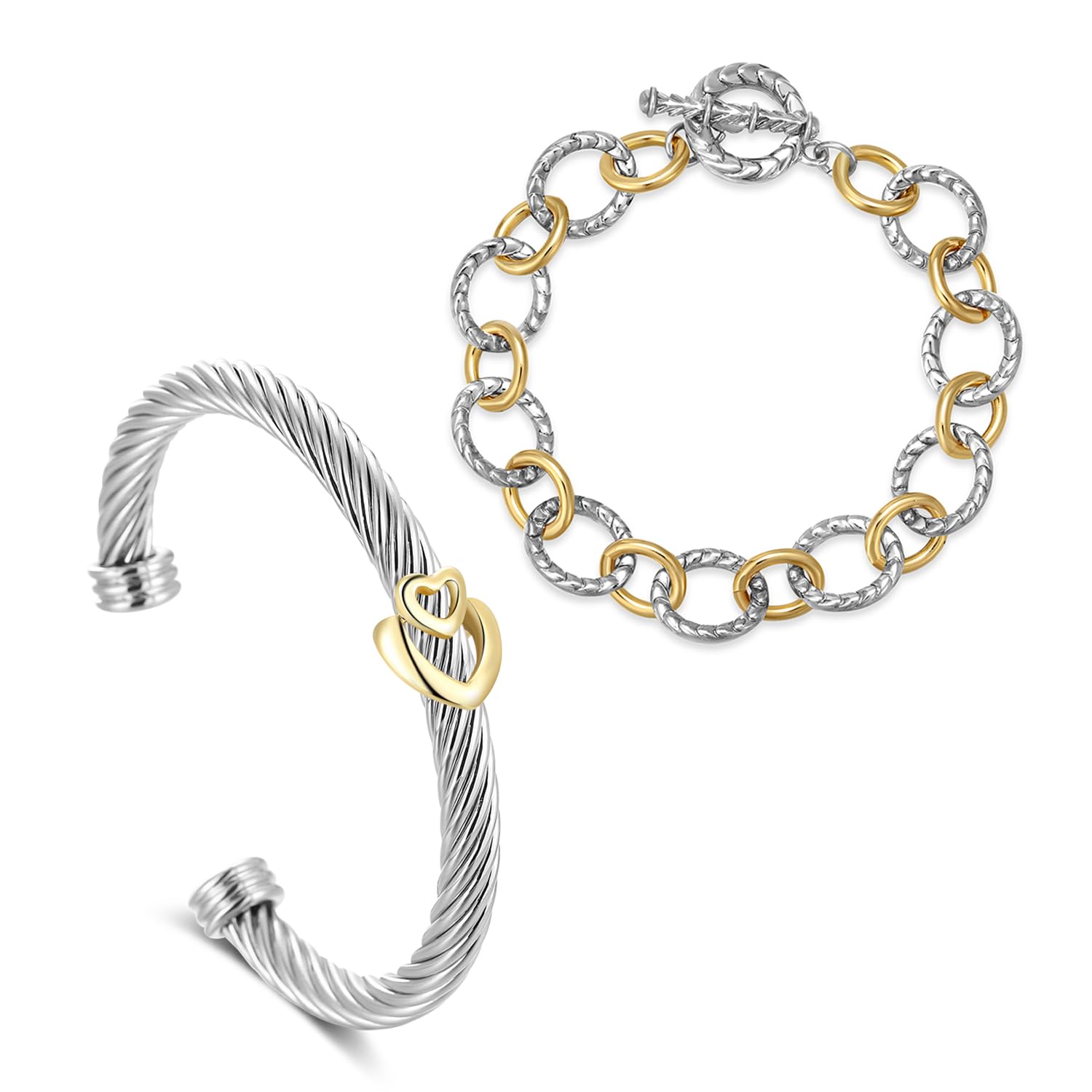 Juego de 2 pulseras trenzadas de cable trenzado, pulsera de dos tonos de oro y plata con nudo dorado, joyería de metal mezclado ajustable para mujer