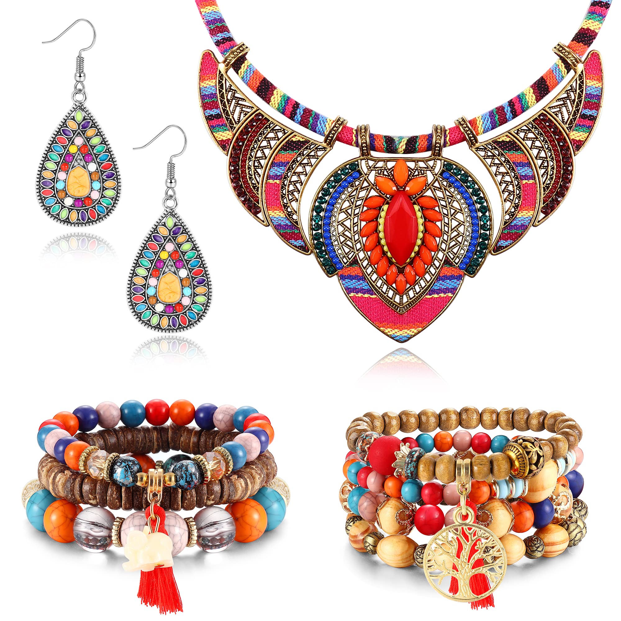 Juego de 4 piezas de joyería bohemia para mujer, estilo étnico, collar de disfraz de revestimiento múltiple, bohemio, pulsera elástica con abalorio clásico, bohemia, circonita cúbica,