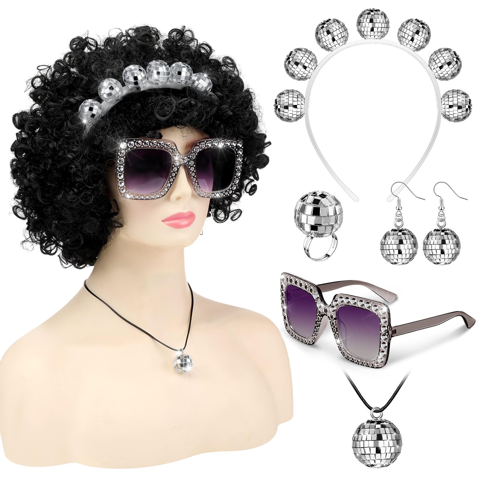 Juego de 6 piezas de disfraces de discoteca para mujer de los años 70, accesorios para mujer, peluca afro, diadema de bola de discoteca, arete plateados, anillo y anteojos de sol para los