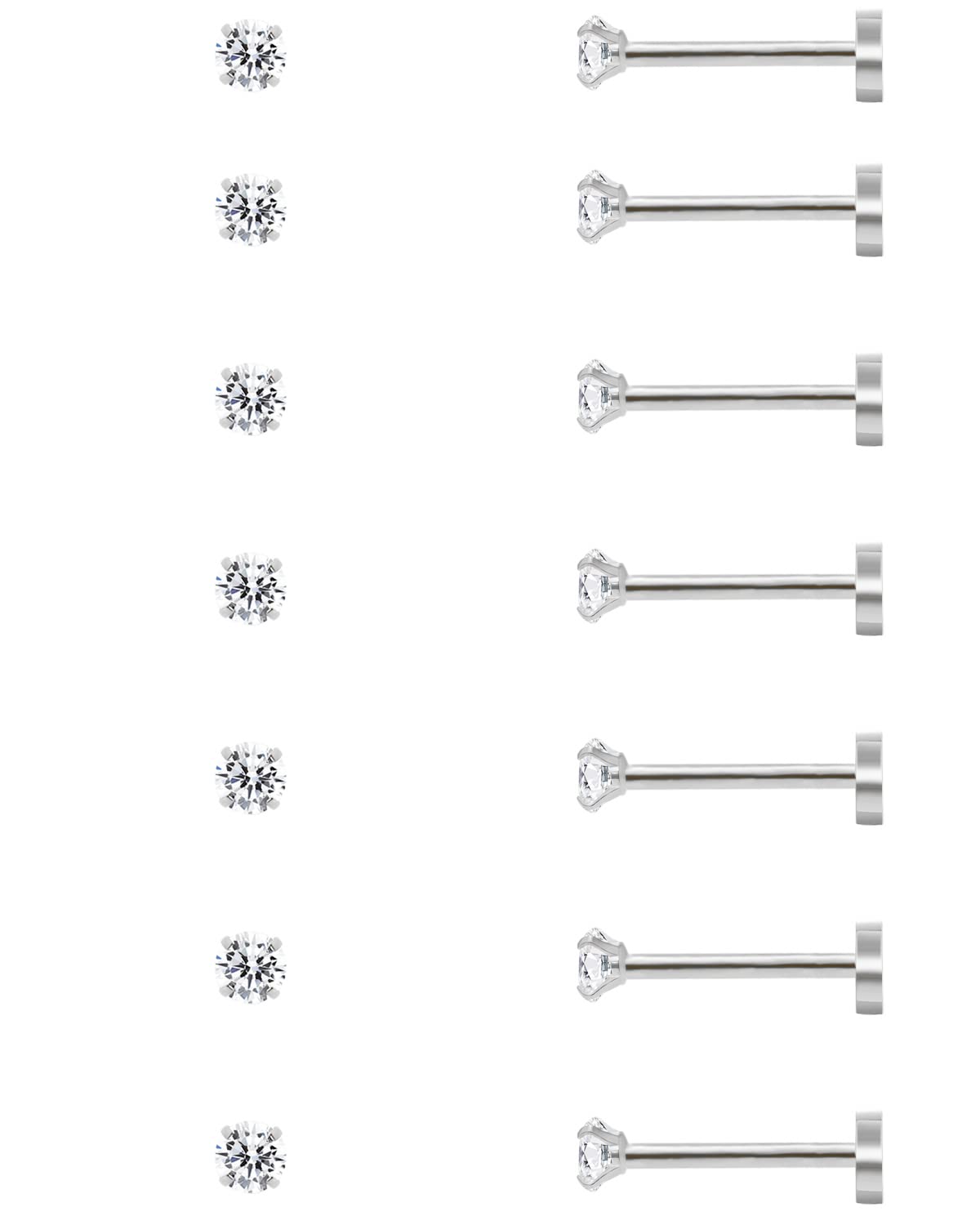 Juego de 7 pares de aretes de tuerca con espalda plana para mujer, hipoalergénicos, de acero quirúrgico y circonita cúbica para lóbulo, hélice de cartílago (2-8 mm)