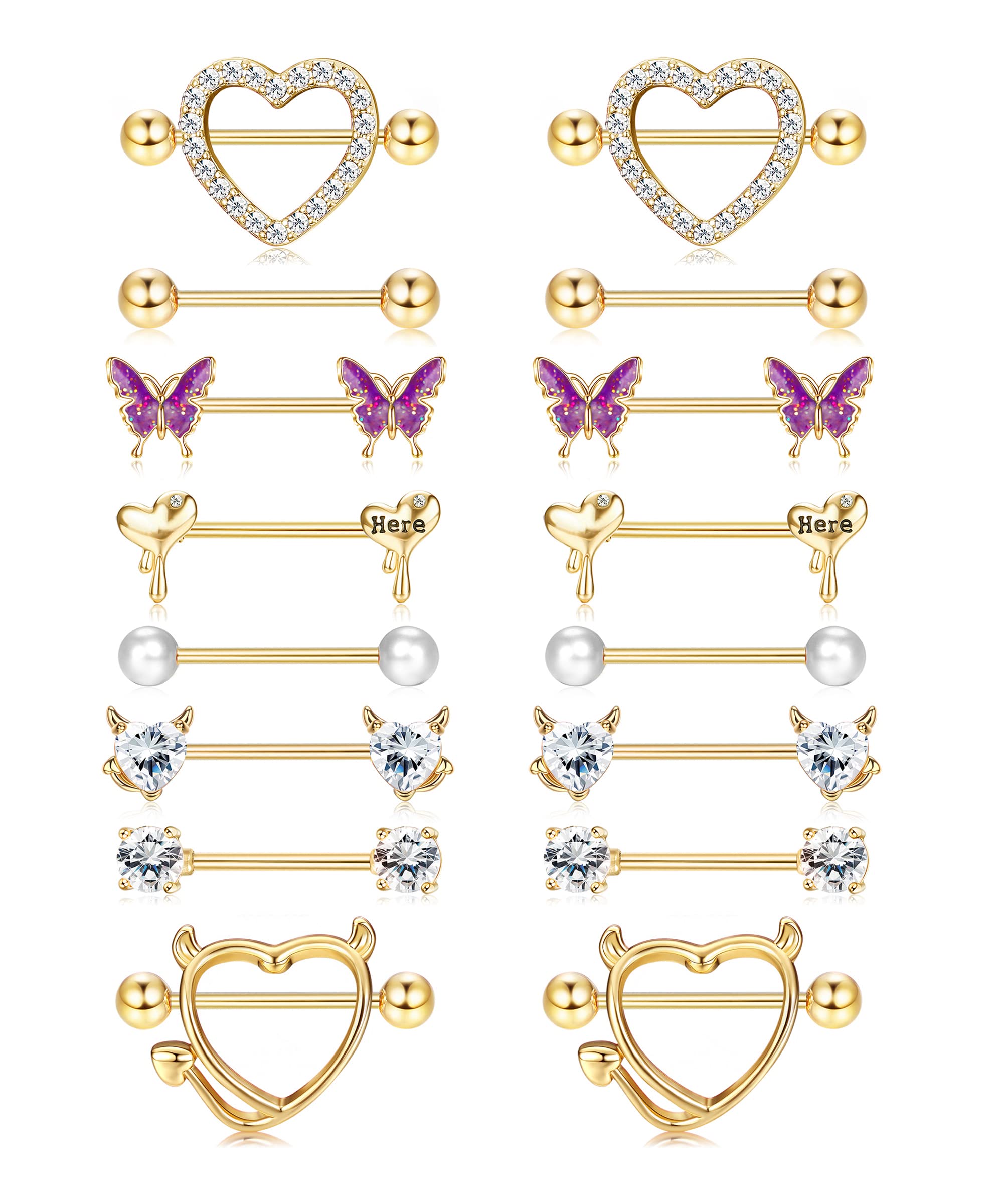 Juego de 8 pares de anillos para pezón de 14 G para mujer, acero inoxidable con circonita cúbica, engarzado, con diseño de mariposa, diseño de corazón, pezón, joyería de 16 mm, 5/8 pulgadas