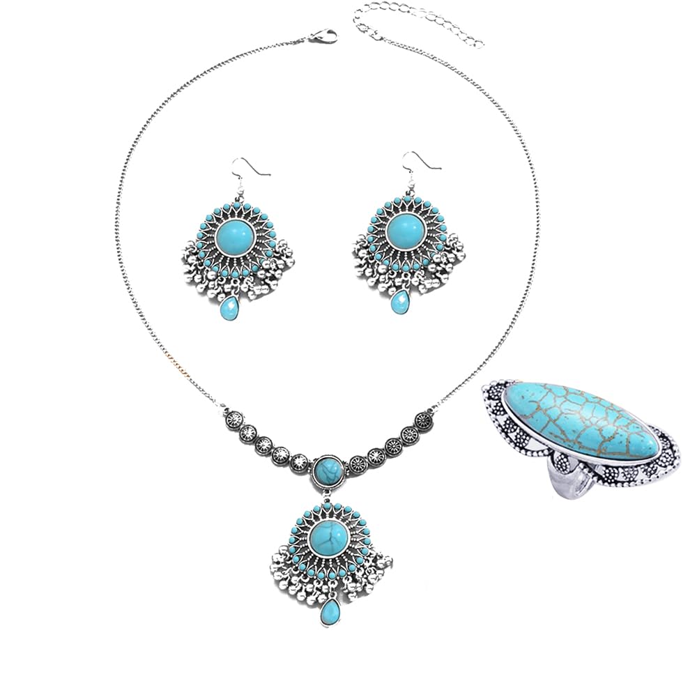 Juego de joyas bohemias de turquesa para mujer, joyería occidental, aretes bohemios, anillos abiertos, collar con colgante, gargantilla con colgante, estilo bollywood, clásico, vaqueras, boda,