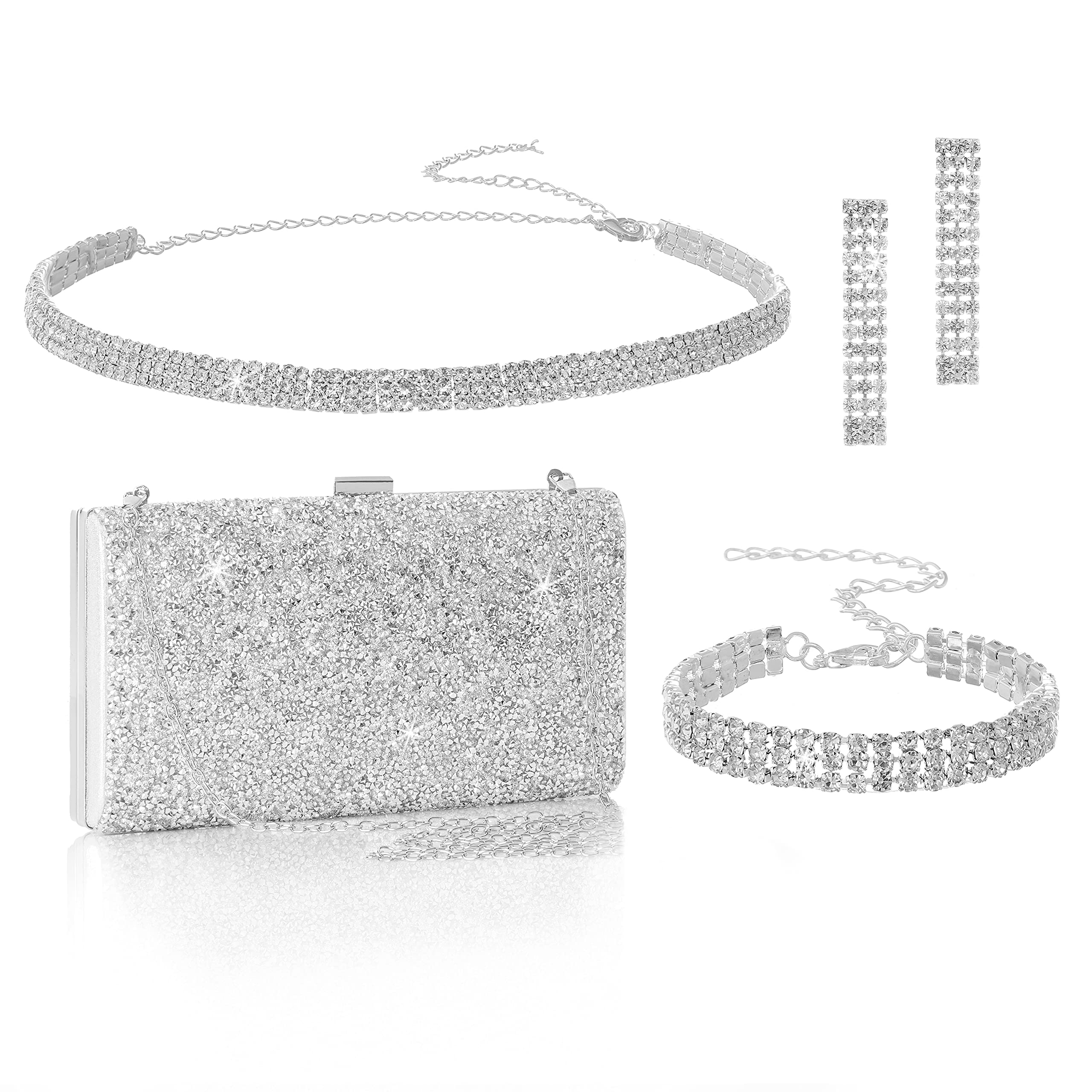 Juego de joyas de embrague de diamantes de imitación para boda, novia, dama de honor, accesorios de plata, para mujer, collar y arete, pulseras, conjuntos formales para mujer, Una talla,
