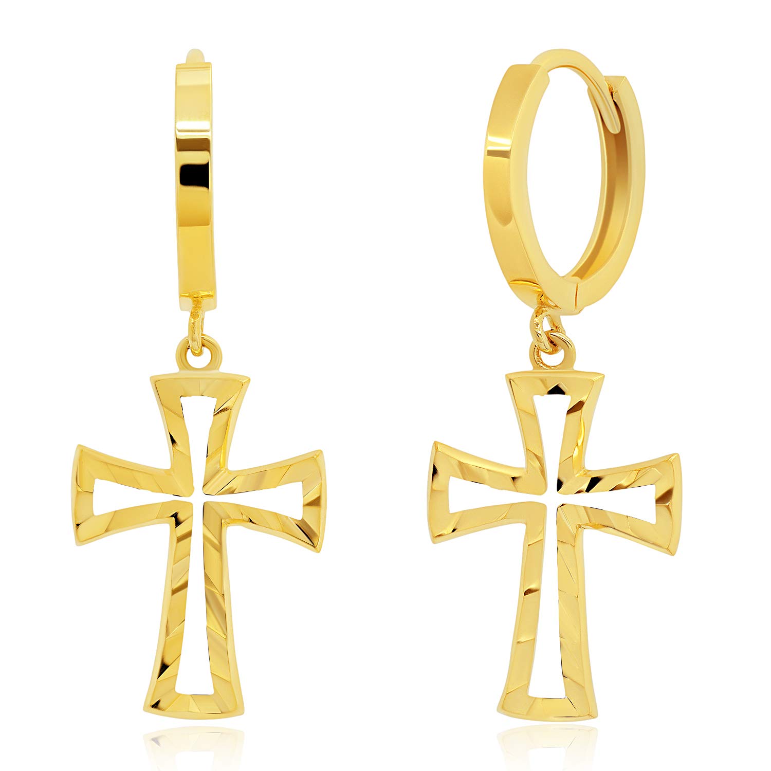 Pendientes de aro minimalistas de oro amarillo de 14 quilates con cruz colgante de corte de diamante