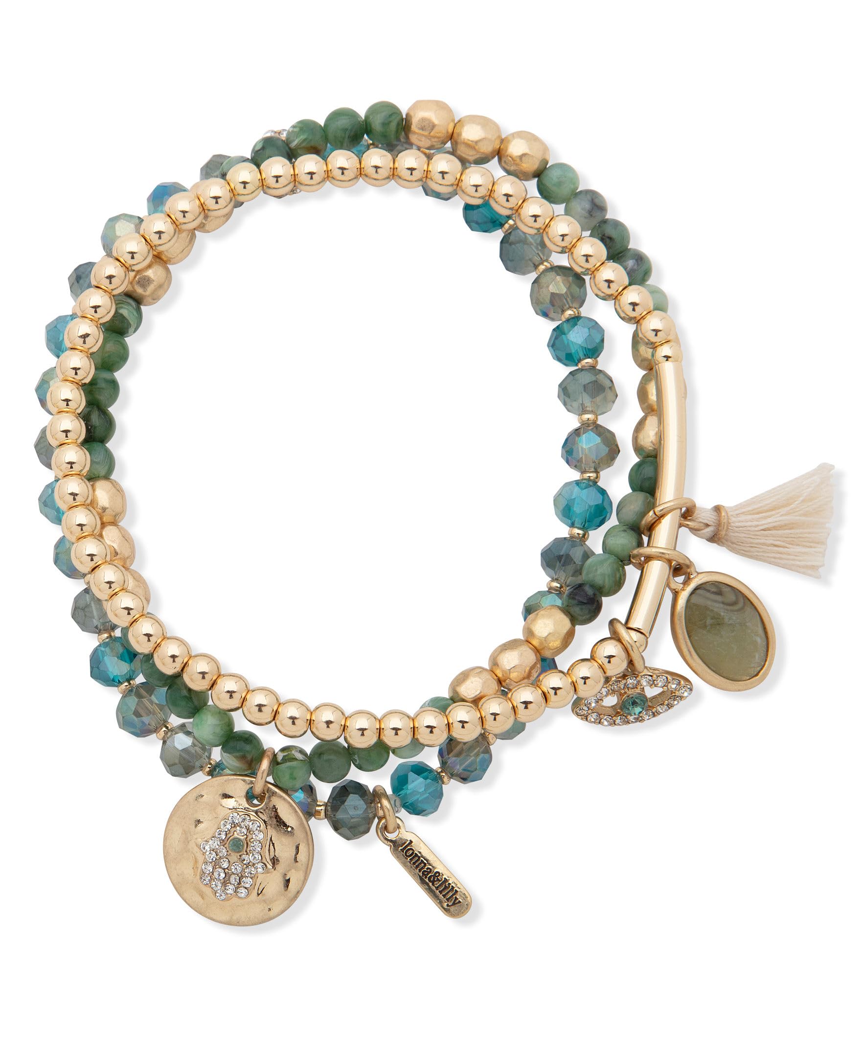 Pulsera elástica de múltiples filas de abalorio doradas con varios abalorios, incluyendo mano Hamsa y mal de ojo, Una talla, Latón, No es una piedra preciosa