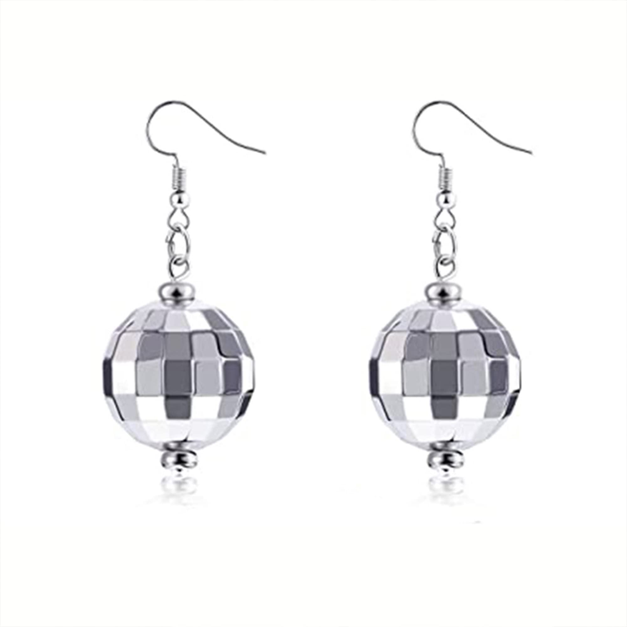 QUPENGXU Disco Ball Drop Dangle Earrings Silver Mirror Ball Earrings 60’s or 70’s Dance Party Costume Earrings For Women