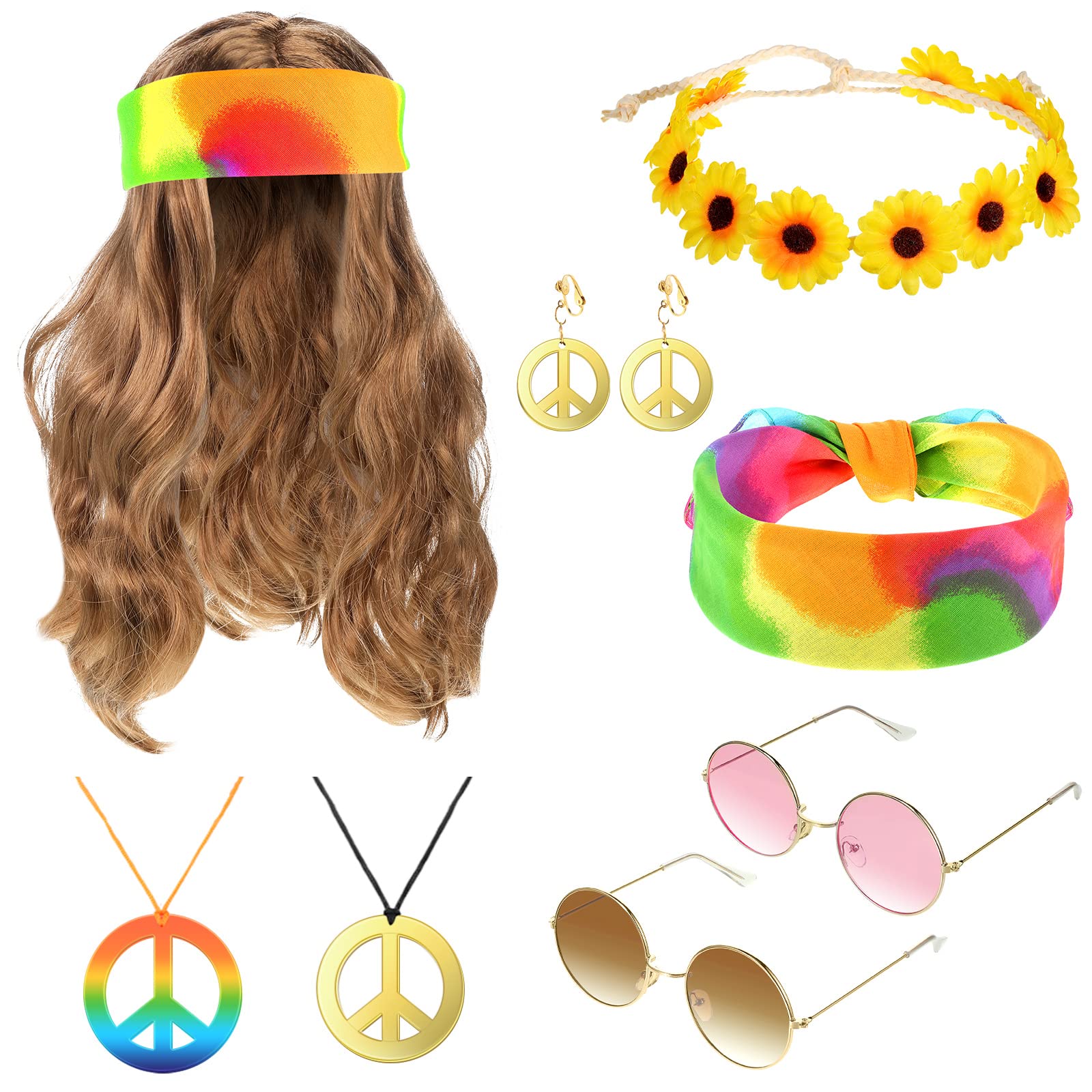 Set de 8 Disfraces Hippie, Incluye Collares de Signo de Melocotón, Aretes de Sol Hippie, Peluca de Corona de Flores, Diadema de Teñido Anudado Accesorios de Fiesta de Halloween 60s y 70s