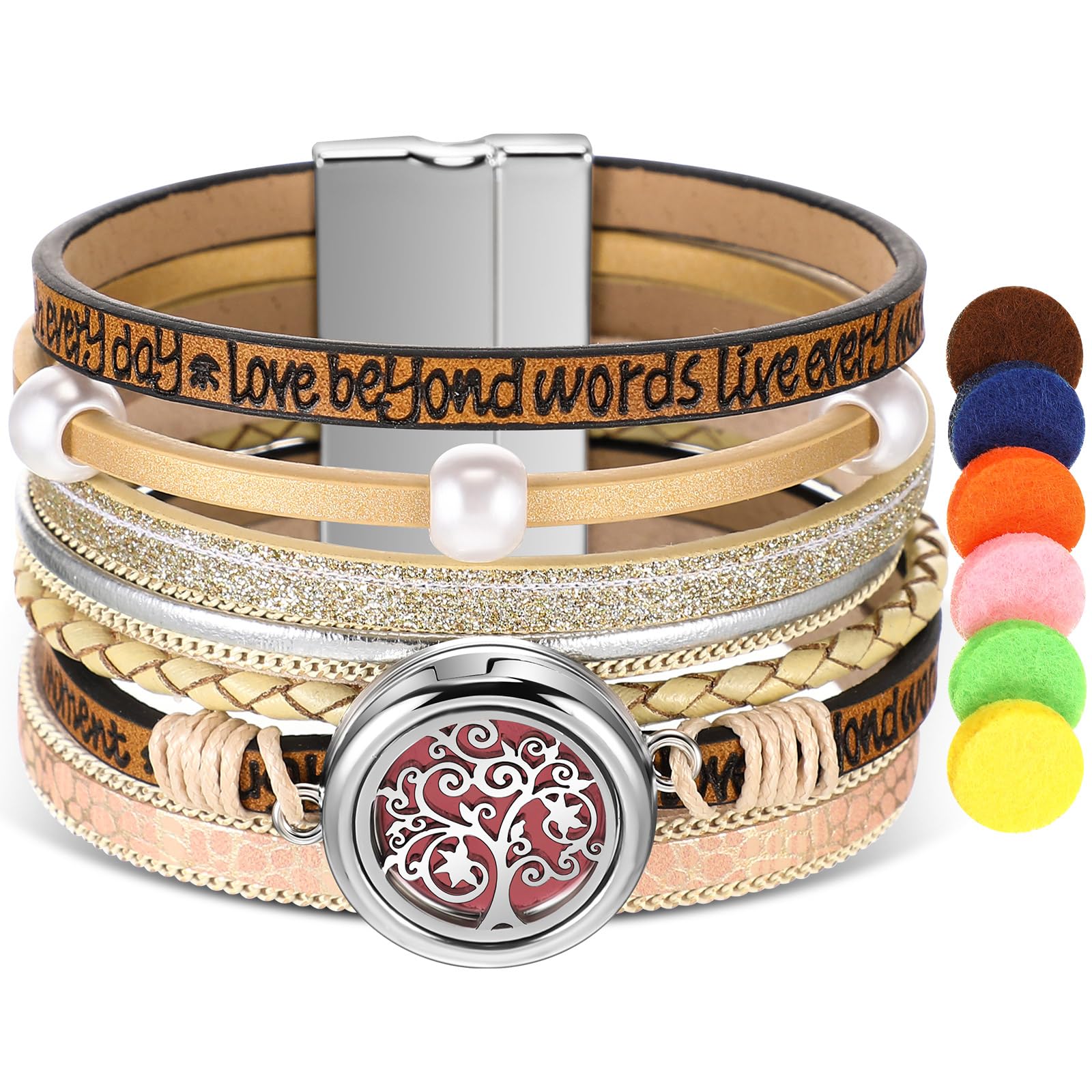 Tondiamo – Pulseras inspiradoras de piel con aceite esencial para mujer, con medallón de aromaterapia, difusor de pulsera de ansiedad con almohadillas para orejas de repuesto, juego de regalo para el